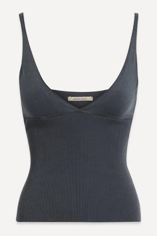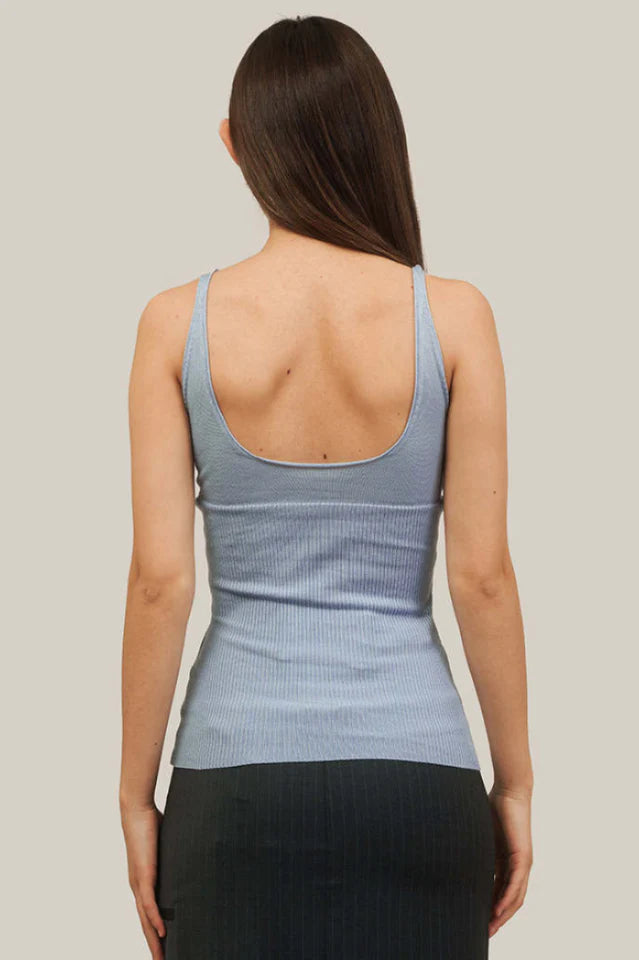 Light blue knitted rib tank top with V-neckline and deep rounded back. Finished hems. Featuers "Paloma Wool" embroidery at side of bust.