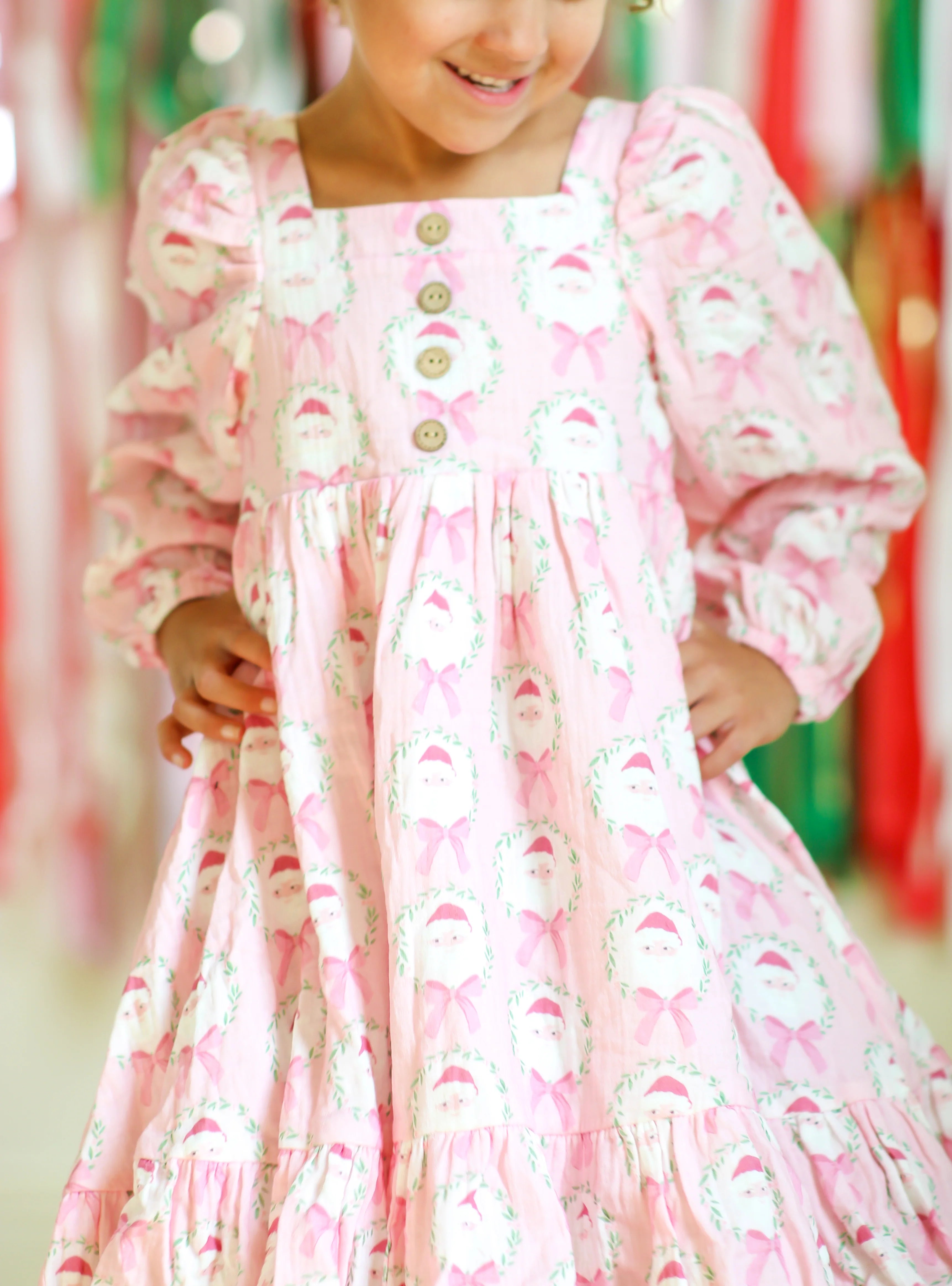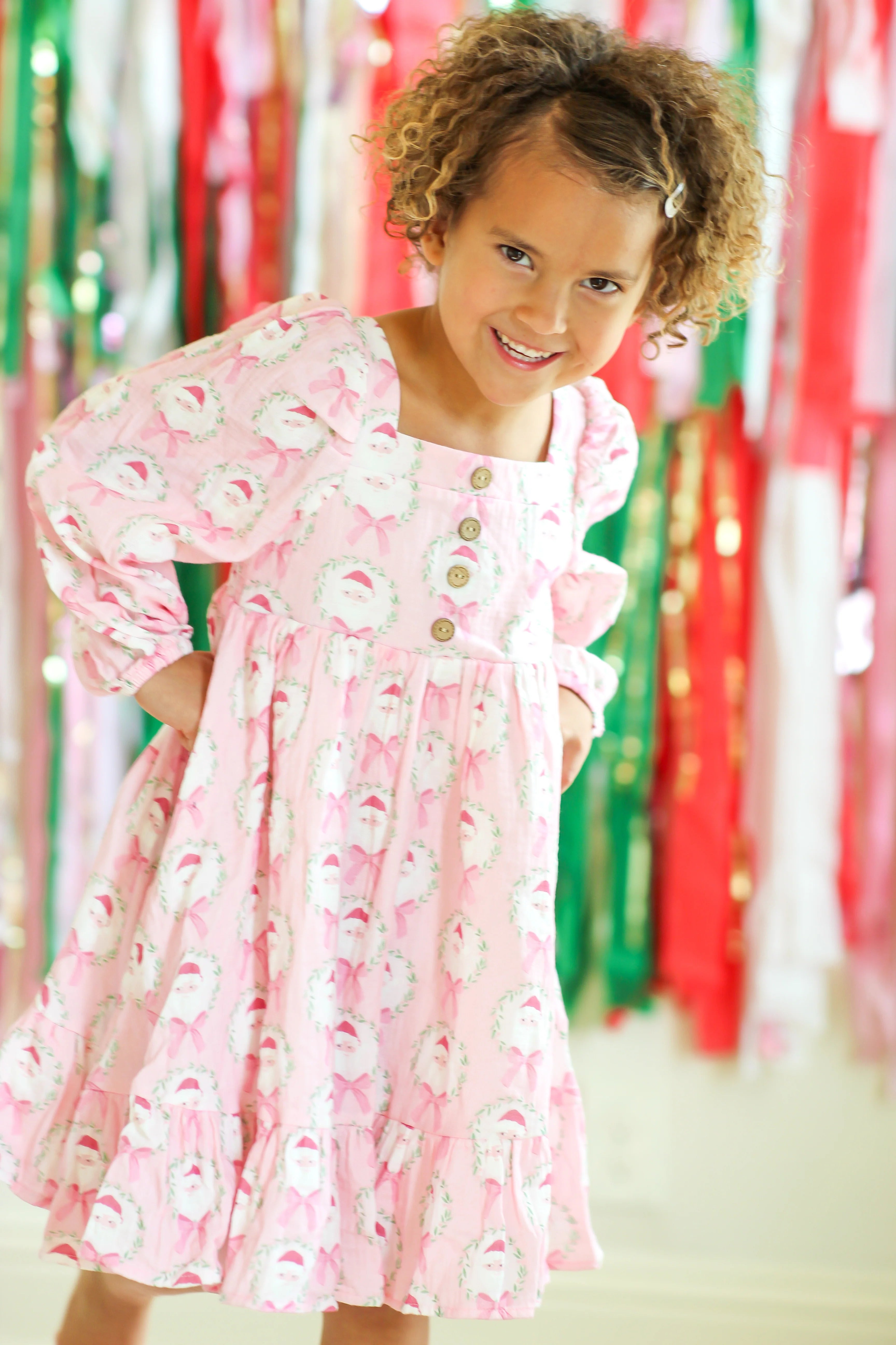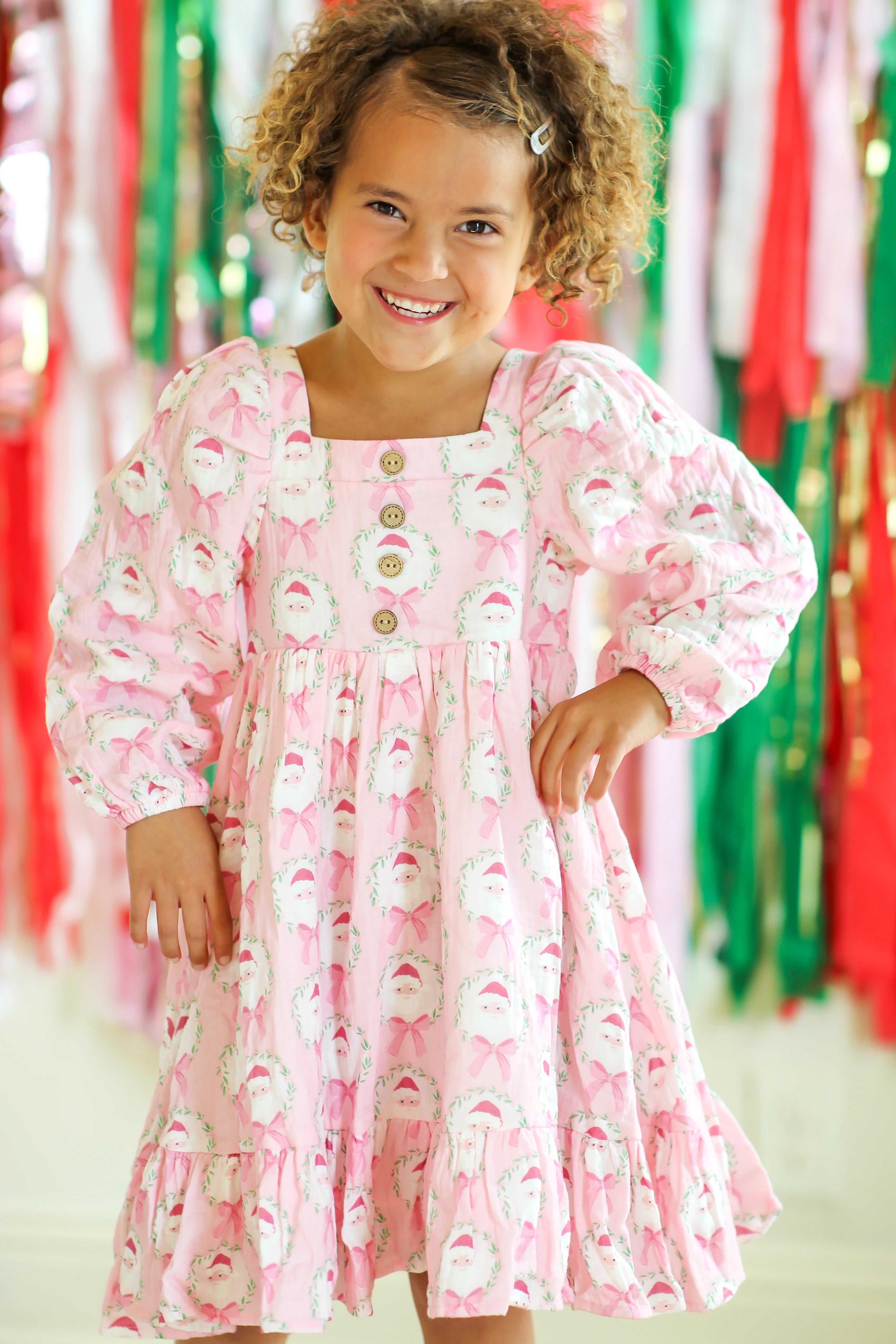 This adorable Puff Sleeve Gauze Dress in a charming Sugarplum Santa pattern is perfect for little girls who love pink and holiday fun. Featuring an allover design of Santa framed in festive garlands with sweet bows, this soft, playful dress brings cheer to any holiday gathering. Cozy, cute, and full of holiday spirit, it’s a delightful choice for festive festivities and joyful celebrations.