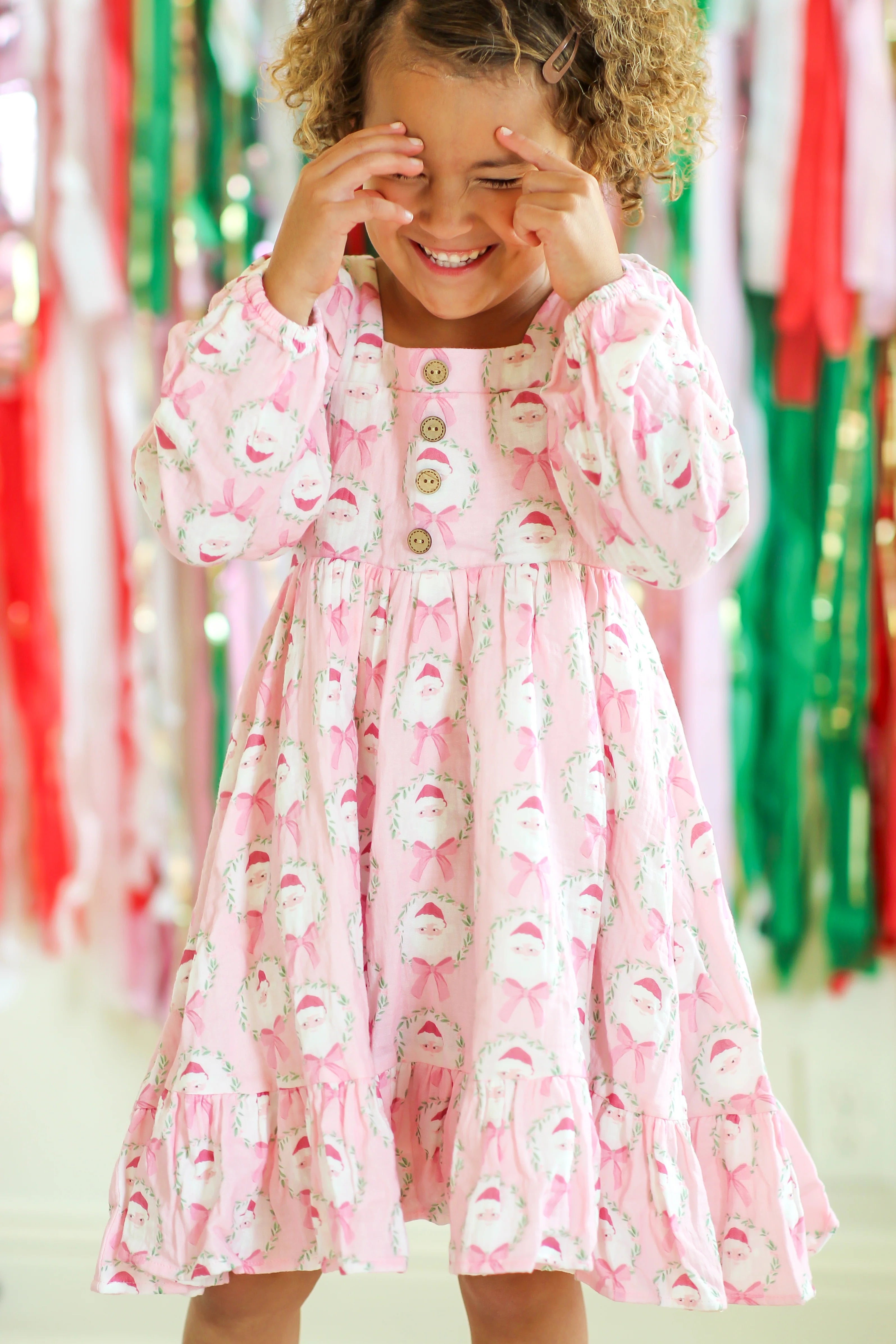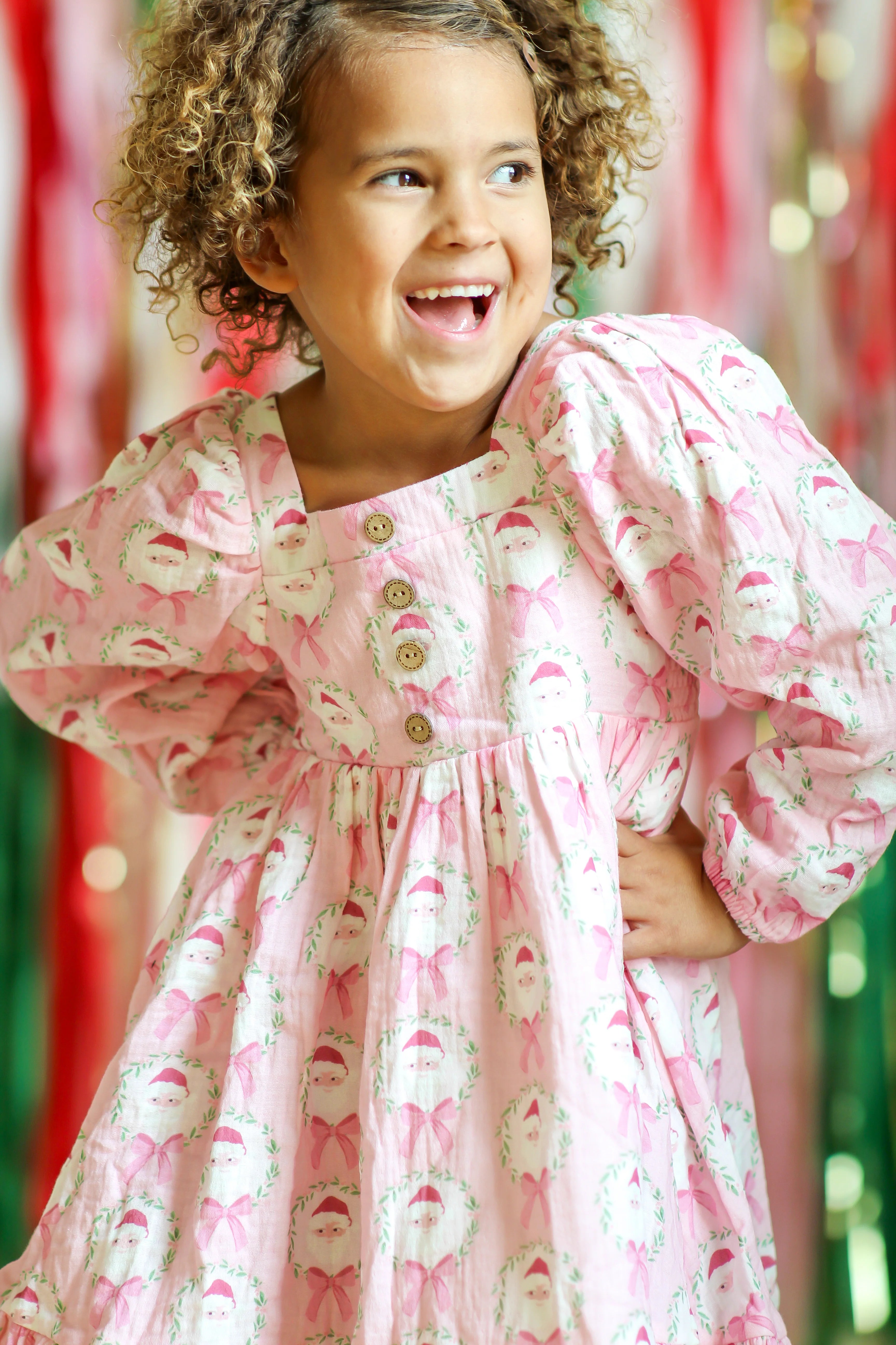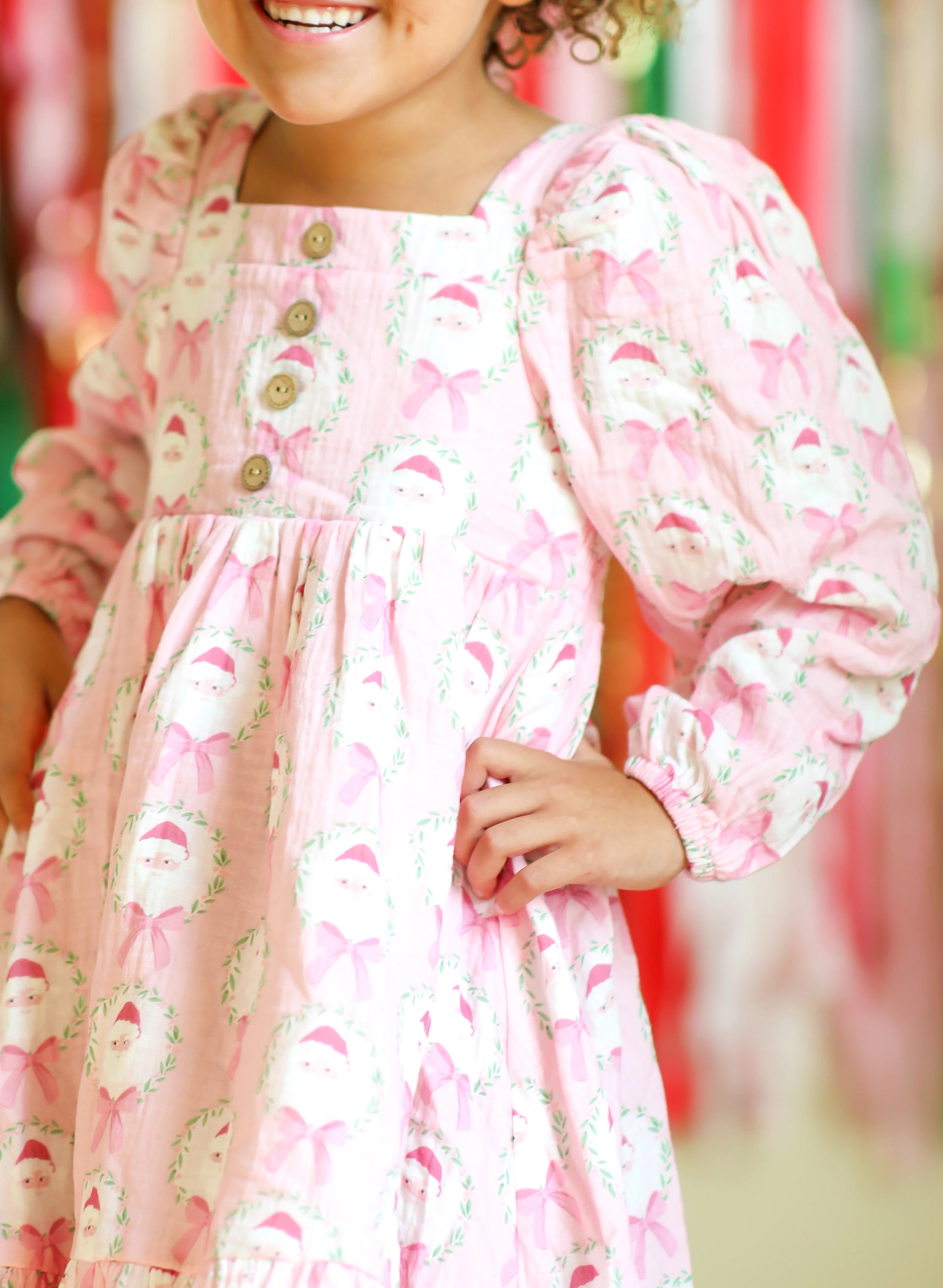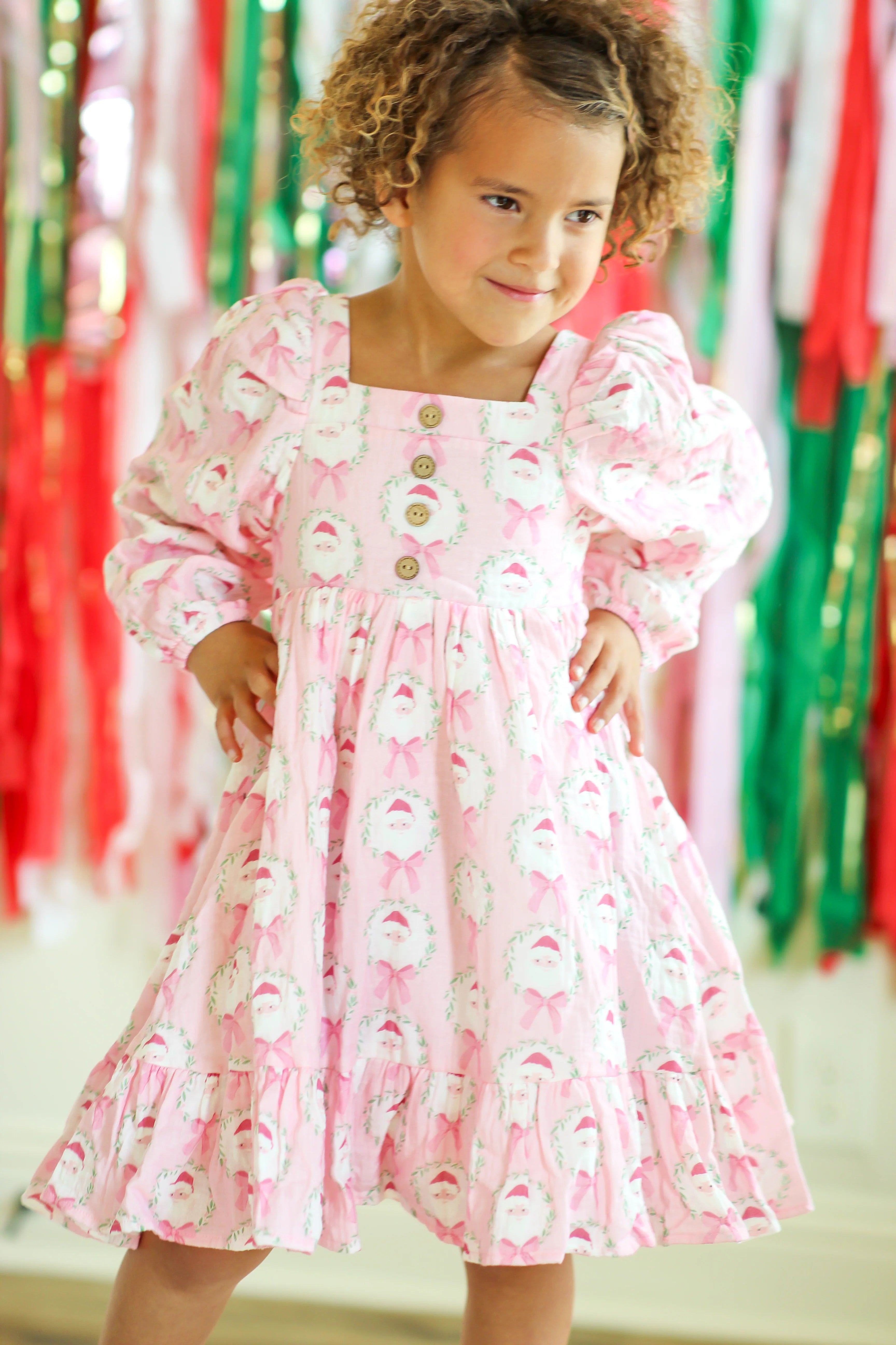 This adorable Puff Sleeve Gauze Dress in a charming Sugarplum Santa pattern is perfect for little girls who love pink and holiday fun. Featuring an allover design of Santa framed in festive garlands with sweet bows, this soft, playful dress brings cheer to any holiday gathering. Cozy, cute, and full of holiday spirit, it’s a delightful choice for festive festivities and joyful celebrations.