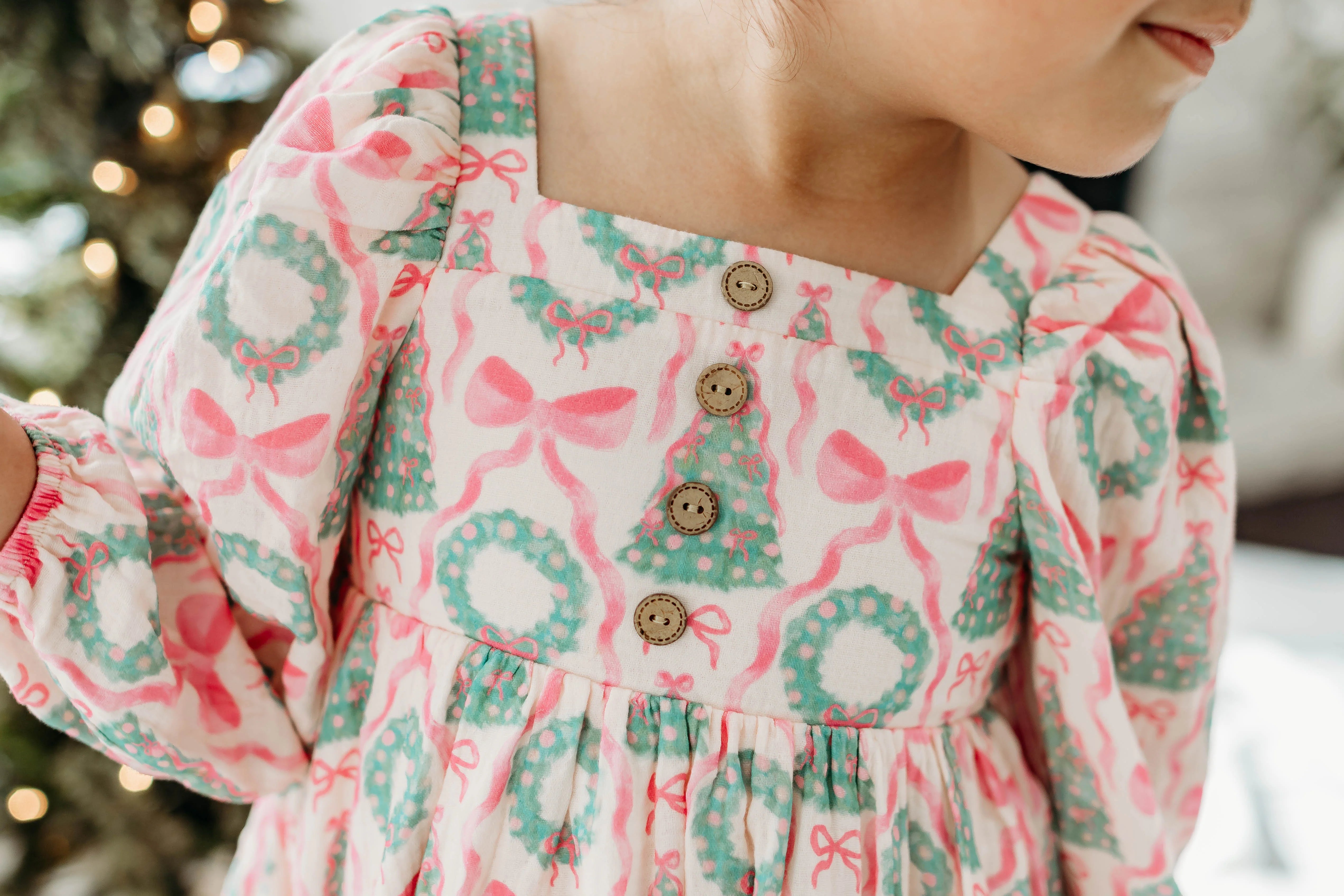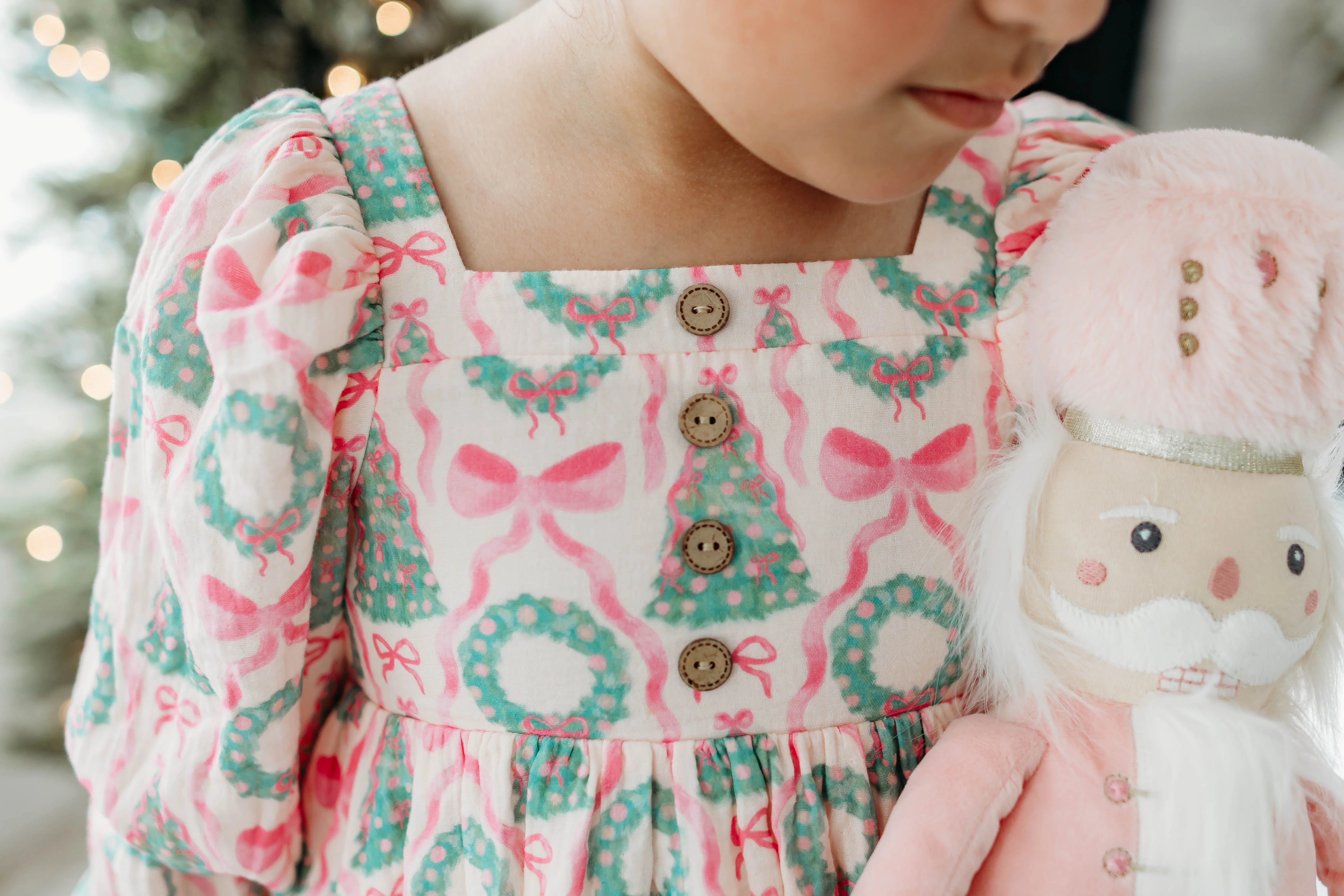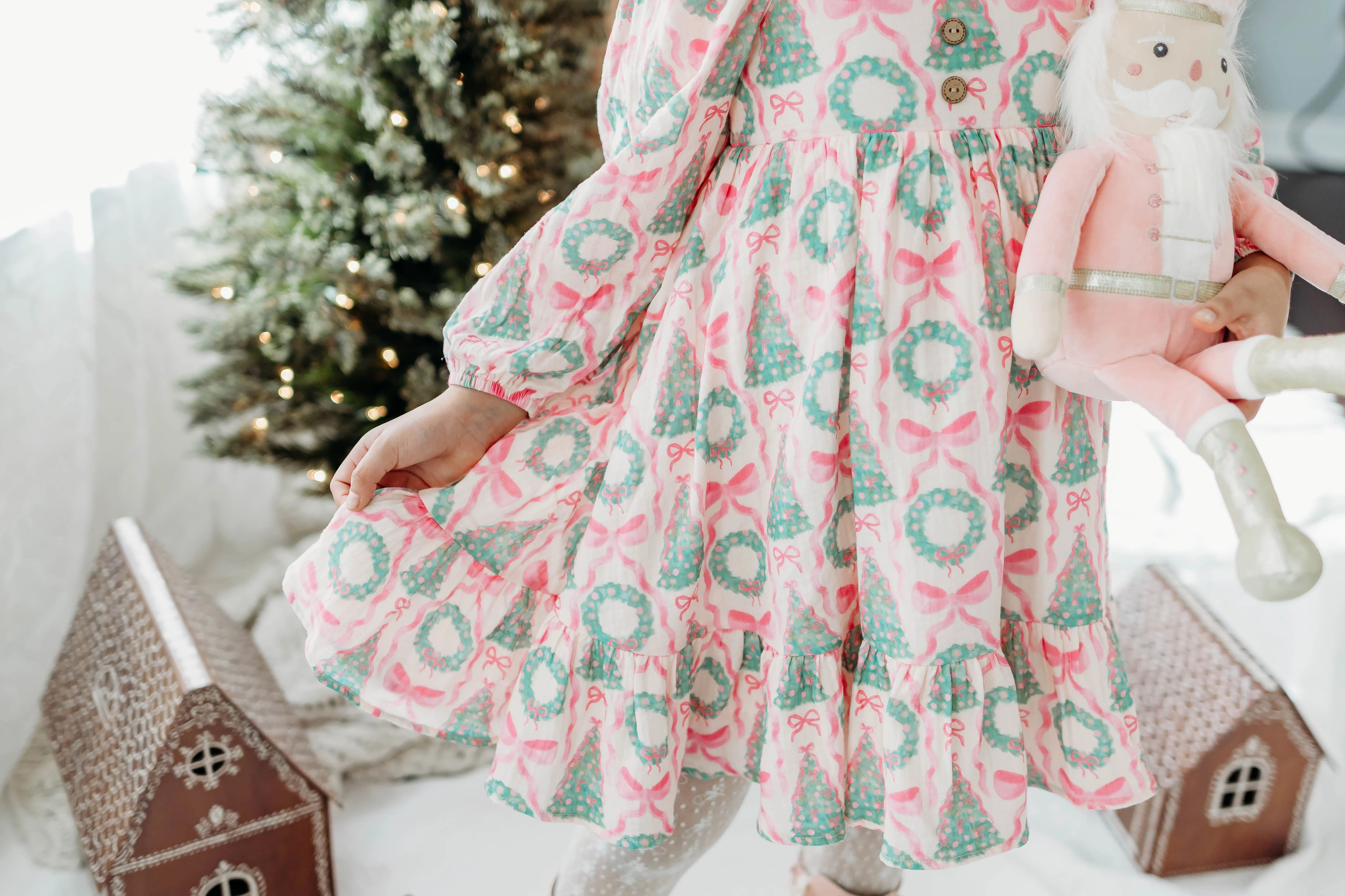 She’ll look oh-so-sweet in the Puff Sleeve Gauze Dress – Wreath & Wonder, with its festive wreaths, bows, and twirl-ready ruffle hem. Light, comfy, and full of holiday charm—perfect for parties, photos, and magical memories!