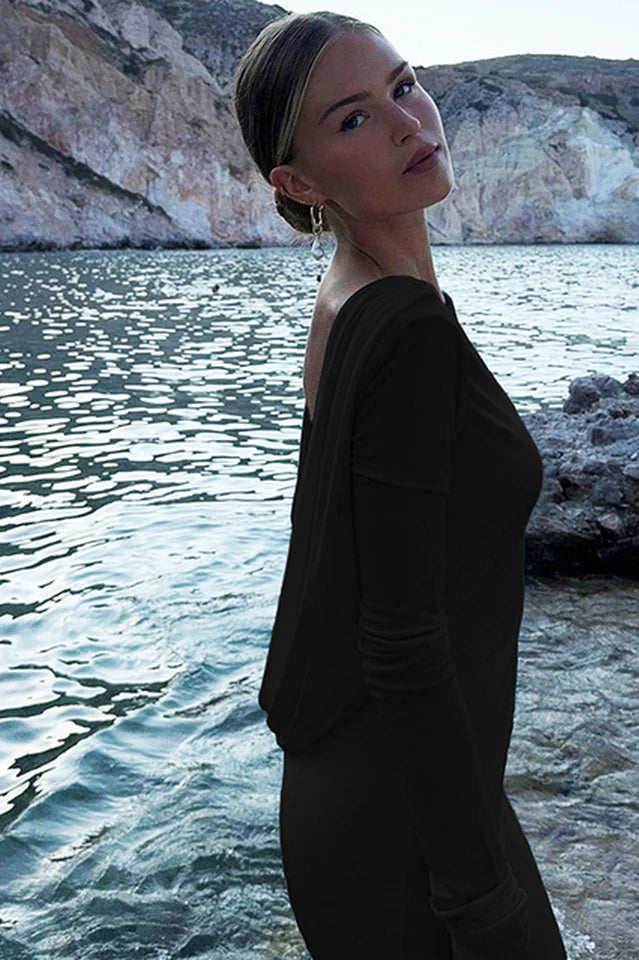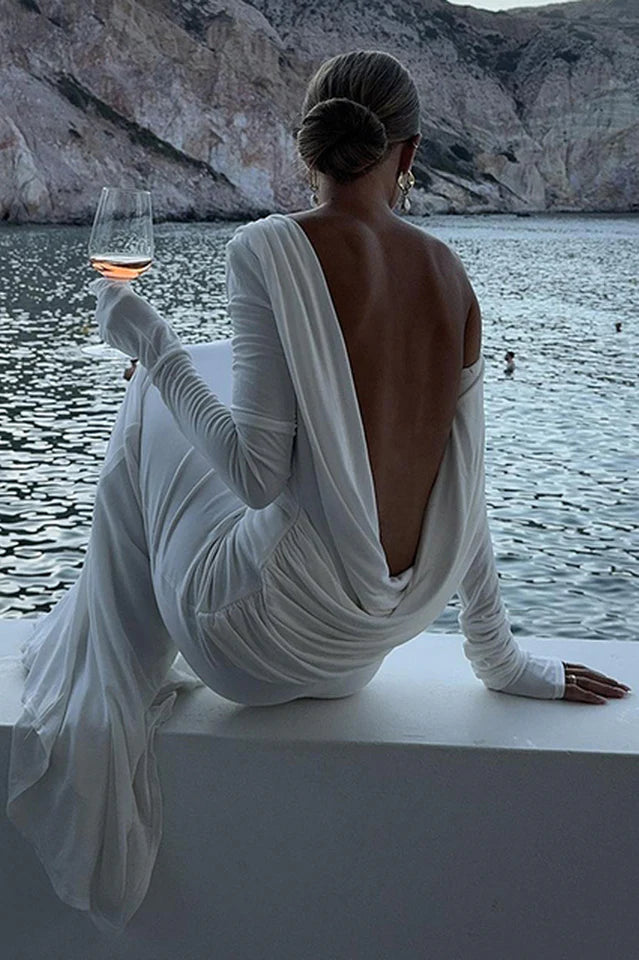 Low Back Drape, Long Sleeve, Mermaid Fit, Maxi Length. Dress Length for Size S: 150cm/59''.