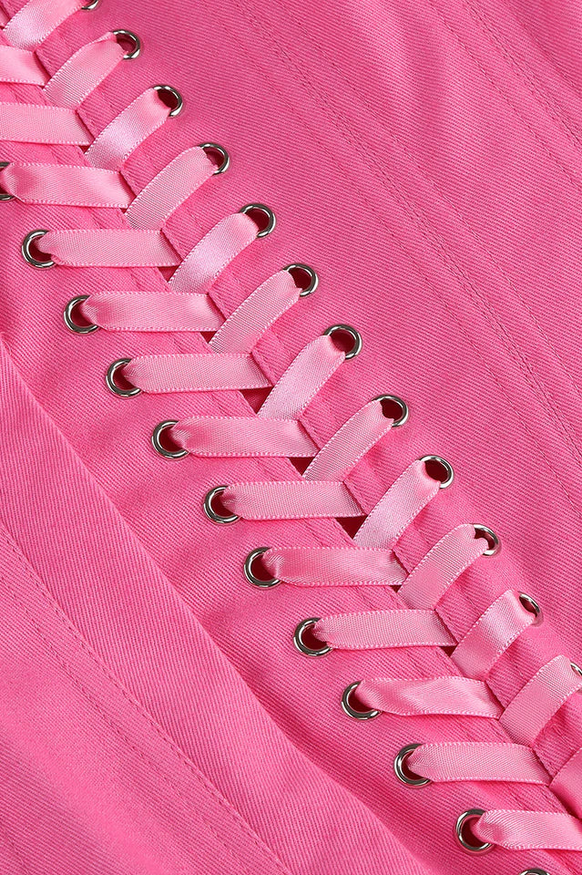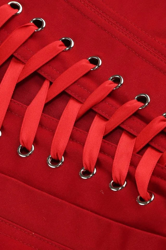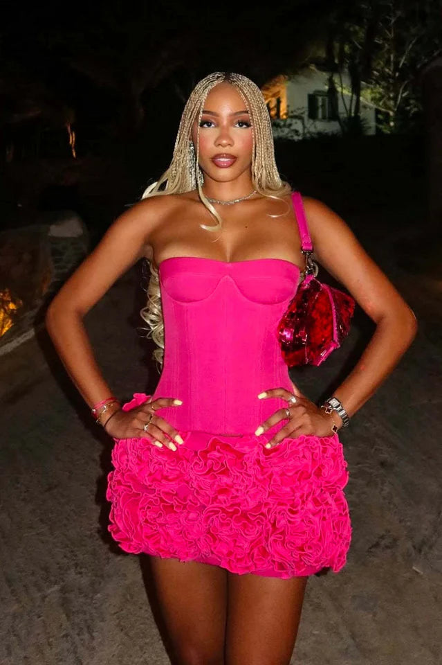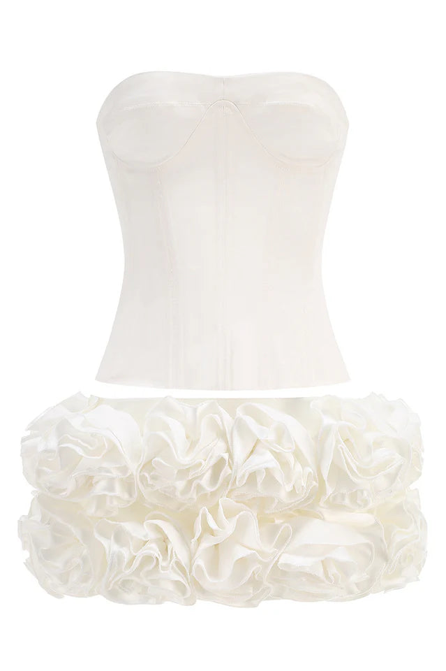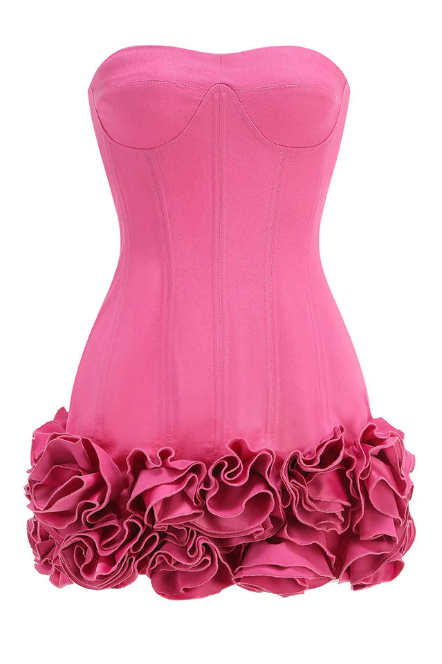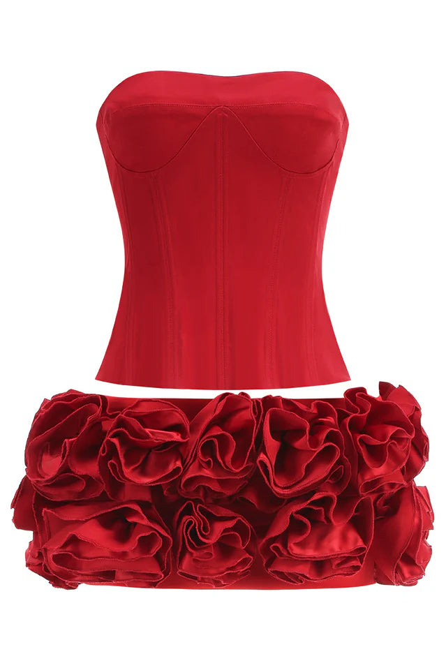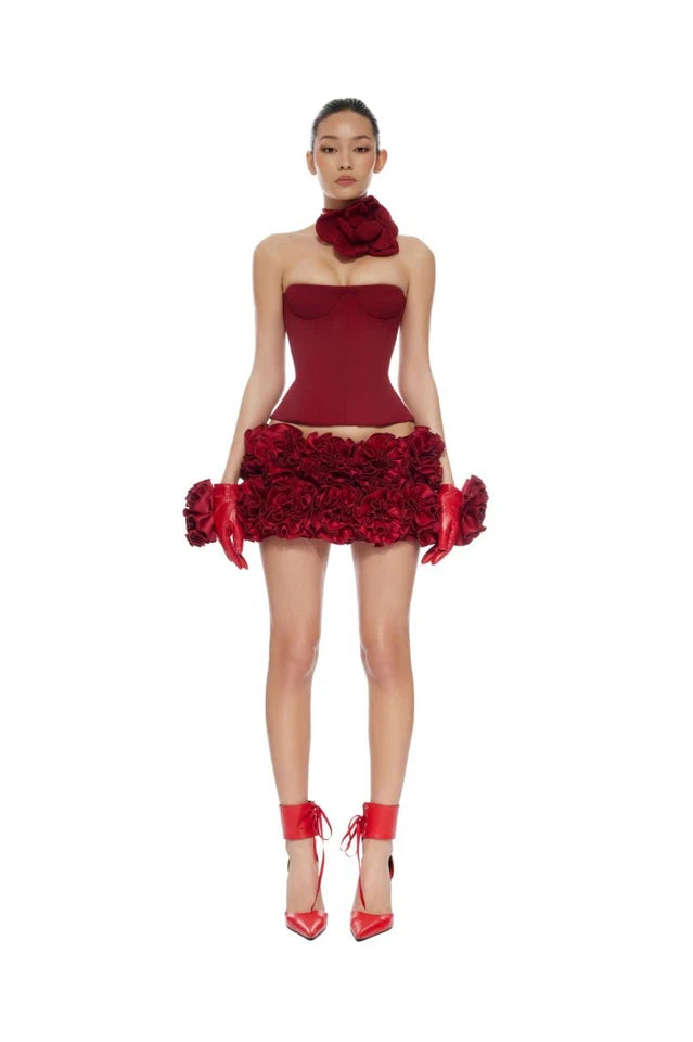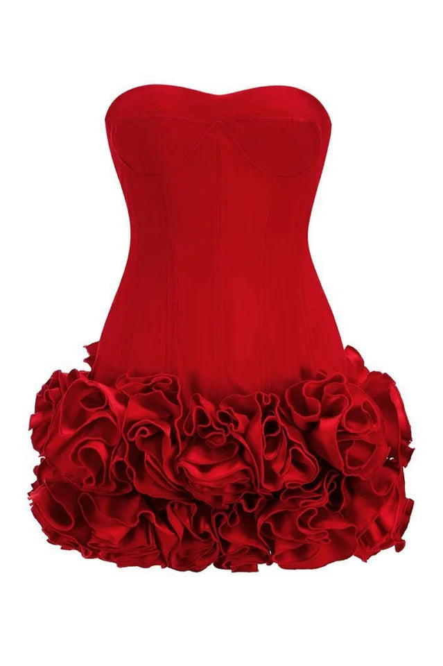 Unleash your inner diva with this sensational strapless mini dress, designed for those who dare to stand out. Crafted in a sultry red, this dress features a corset-style bodice that sculpts and cinches the waist, providing an ultra-flattering fit. The statement-making skirt is adorned with intricate, voluminous rosettes, creating a striking silhouette that exudes romance and drama.