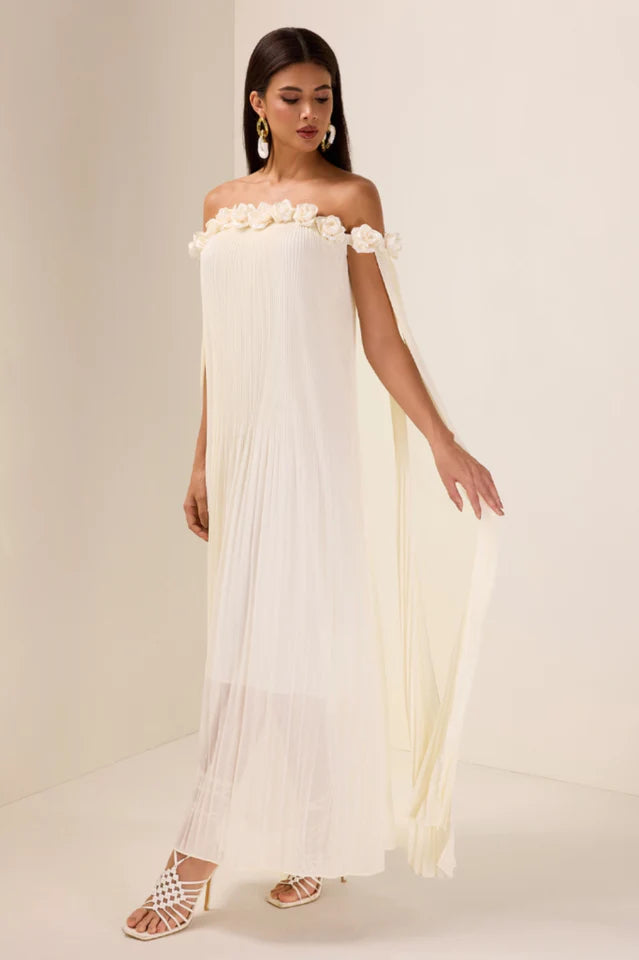 The Regina Off Shoulder Rosette Detail Maxi Dress highlights a pleated skirt and a neckline adorned with 3D rosettes for a romantic touch. Made from a soft, slightly stretchy blend, it brings ease and elegance to both destination weddings and formal receptions. Admired among refined semi-formal wedding guest dresses, it also shines as one of the most graceful wedding guest maxi dresses.