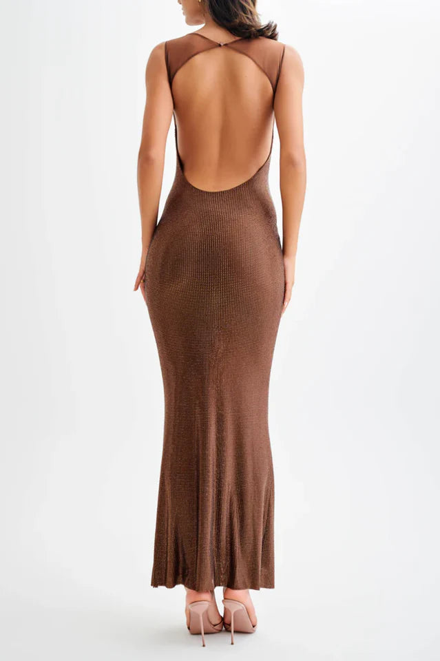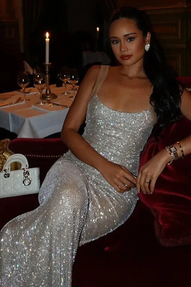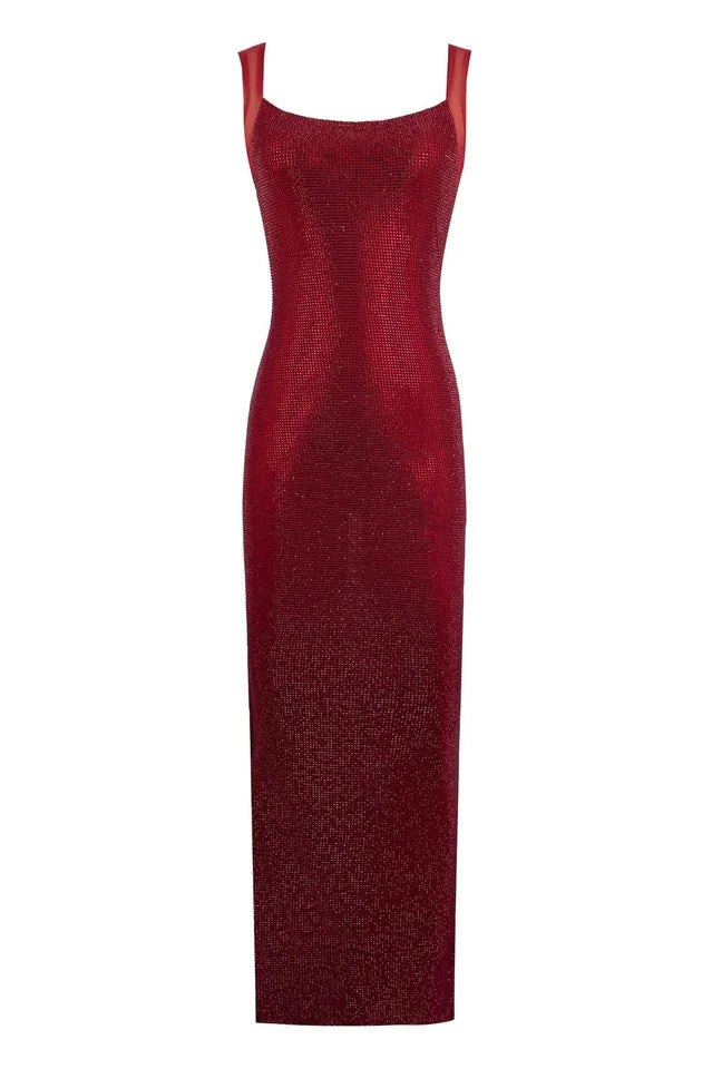 This slim-fitting dress features a classic square neckline and delicate straps, perfectly balanced by an all-over sparkle that catches the light with every movement. The full-length silhouette and subtle shimmer exudes sophistication and allure.