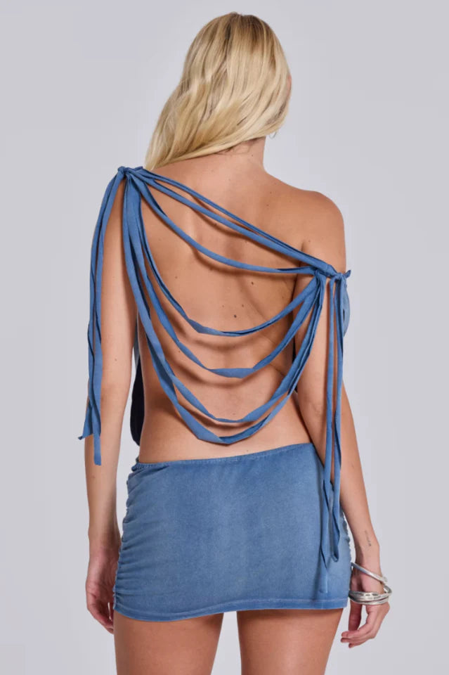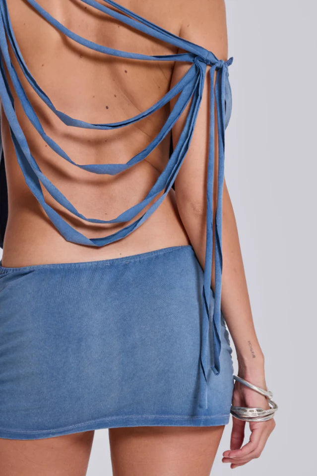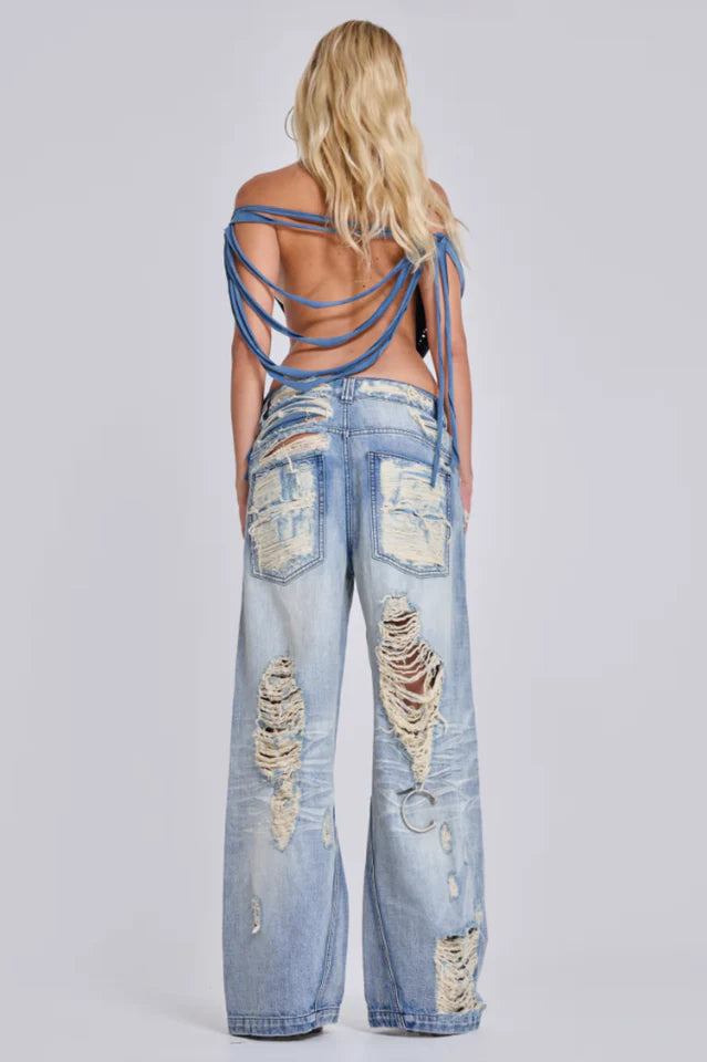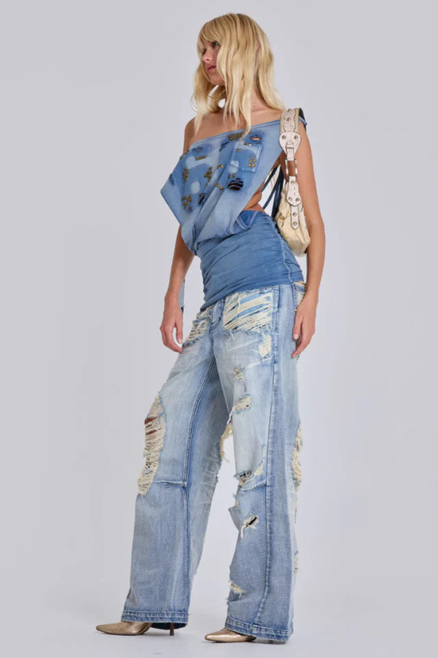 Extreme distressed jersey dress with 66 artwork embellished in studs and distressing.