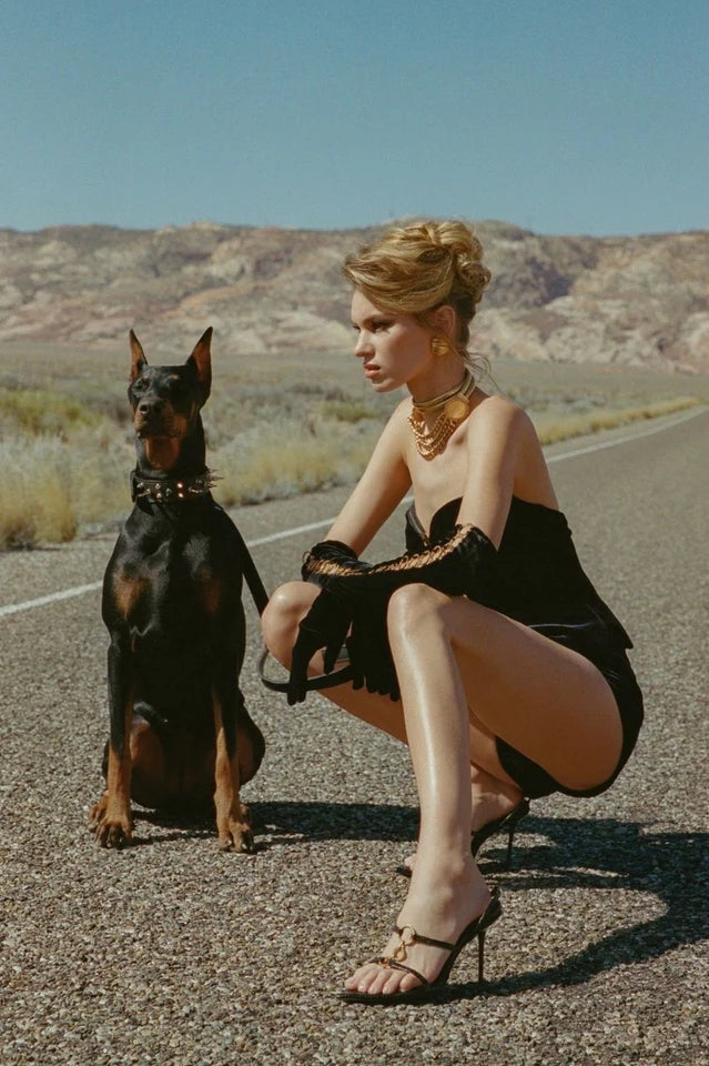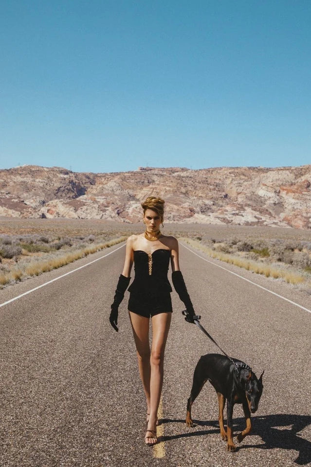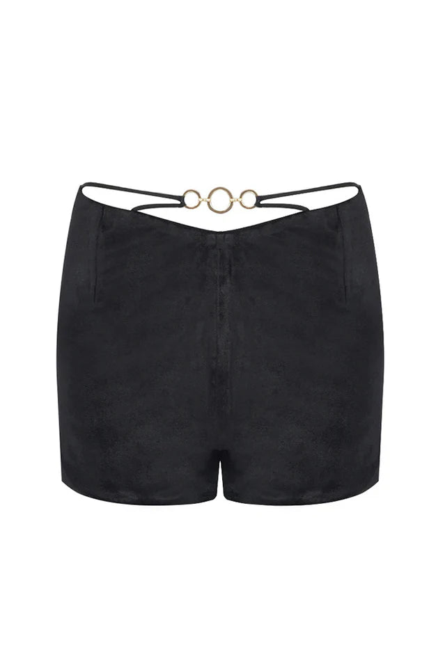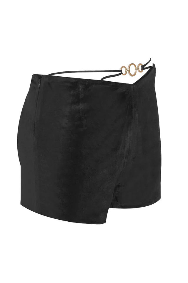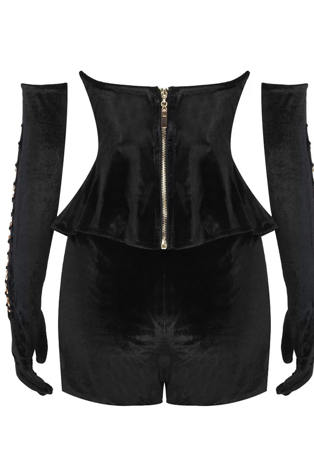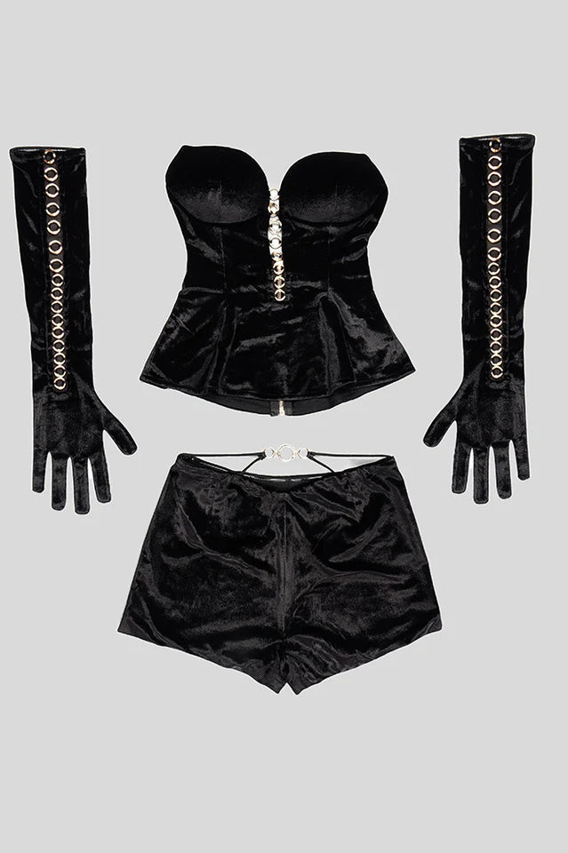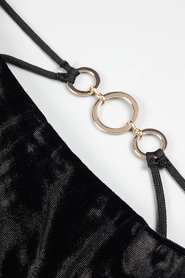 The Sahara Tube Top features a velvet fabric form-fitting and the cut-out gold rings on the chest offer a unique and dreamy detail.