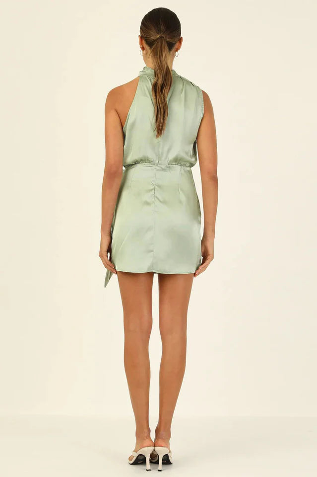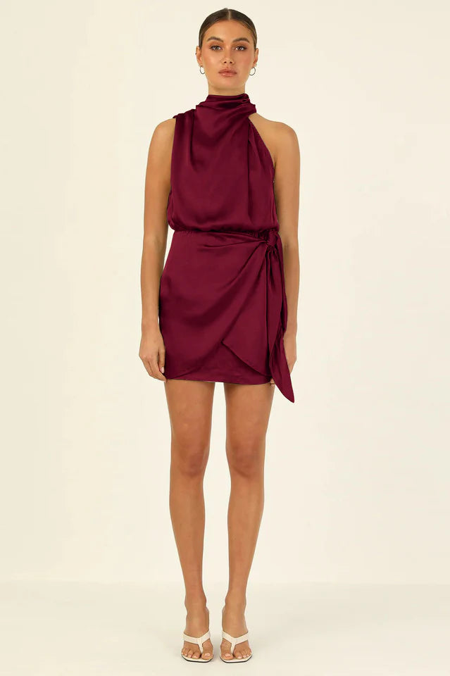 Sophisticated and classy, in the gorg little Santorini Dress! She features a high neckline with an asymmetrical sleeve cut, flowy fitting skirt with a wrap and tie design, silky soft material and a cut out detail at the back with a button + zip closure. Match her with Black Heels and a bold Red lippy.