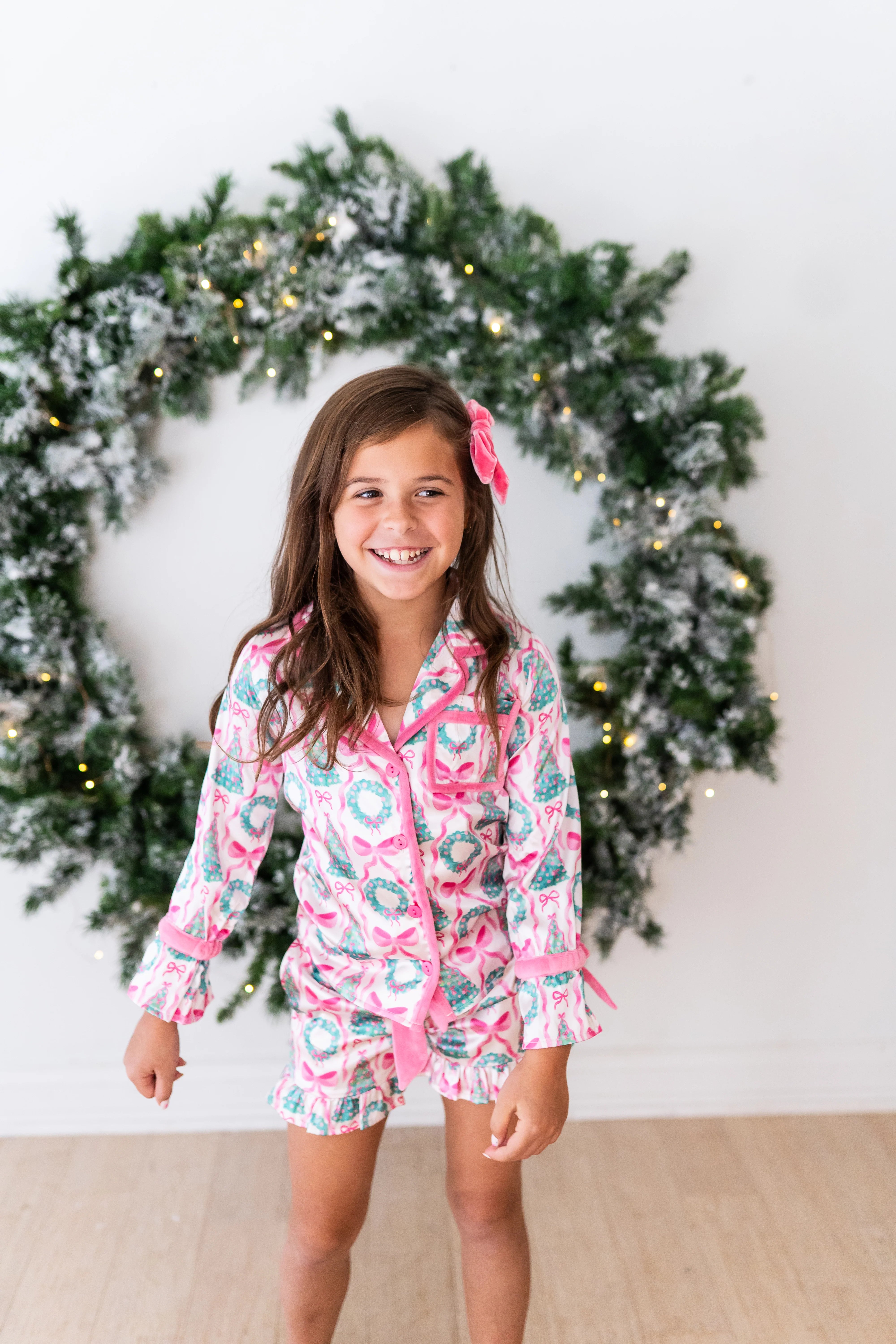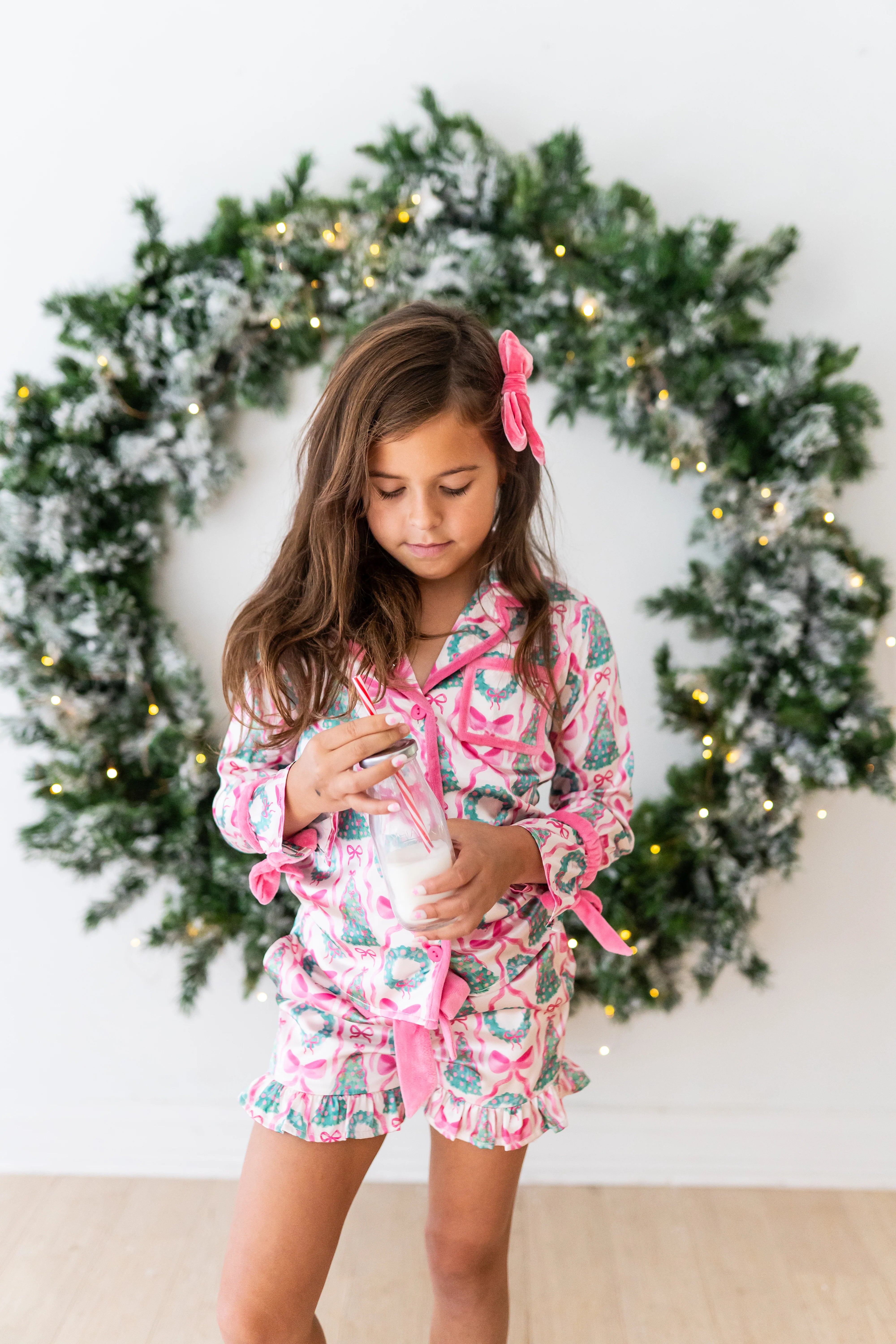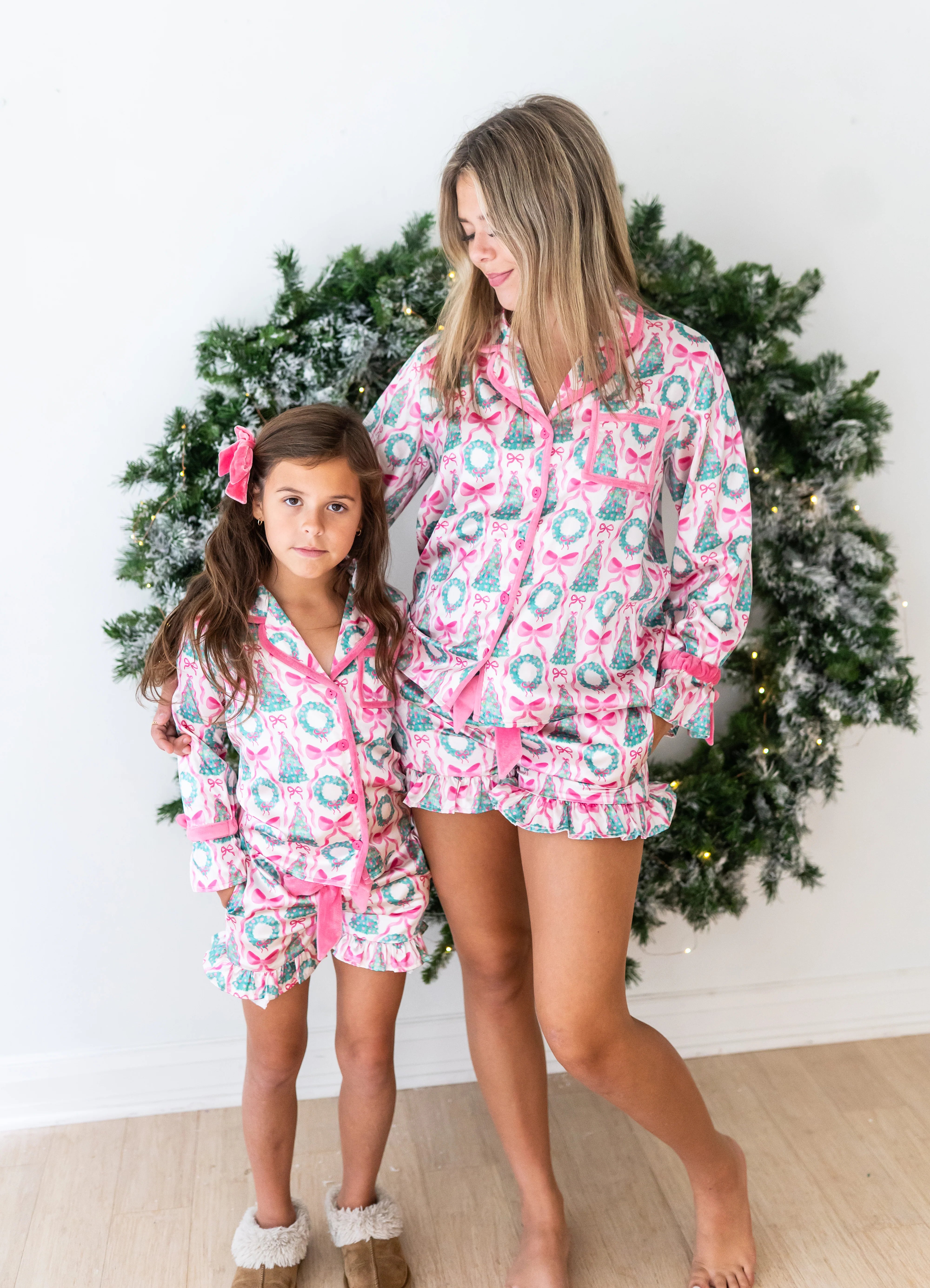 She’ll be holiday-ready in the Satin Loungewear Set – Wreath & Wonder, with its silky satin, ruffle trim, and festive print of bows, wreaths, and trees. Perfect for cozy nights, Christmas mornings, and magical memories!