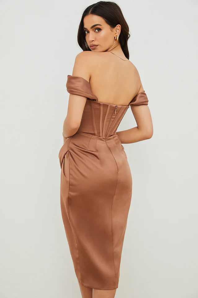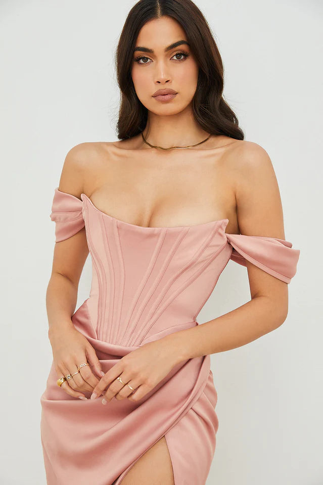 This satin dress is super sexy with a very languid vibe. It has a balconette cut to the bodice for great uplift and pert, round boobs that sit up high and the bodice has our extra special corsetry boning to the front, side and back to ensure perfect support and uplift. Just in case that's not enough lift for you, the bodice also has our extra special 'side boob' boning for ultra cleavage. The skirt gathers to the hip - flattering for the tummy area and the hips. We love the way the sleeves drape sexily off the upper arm and the skirt split that flashes just the right amount of flesh.