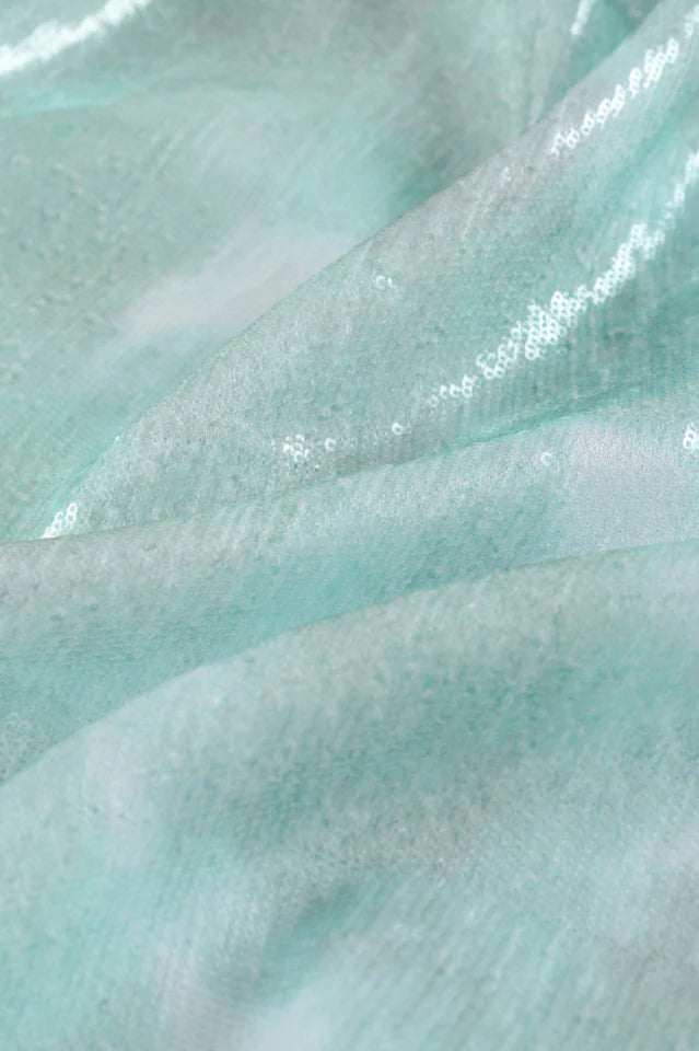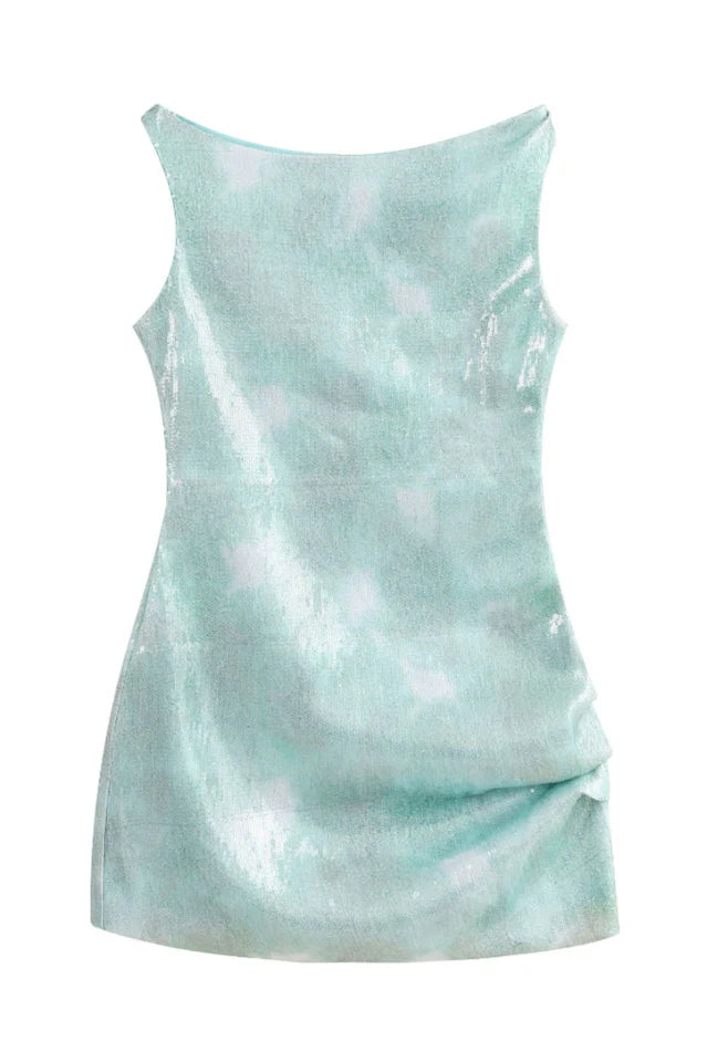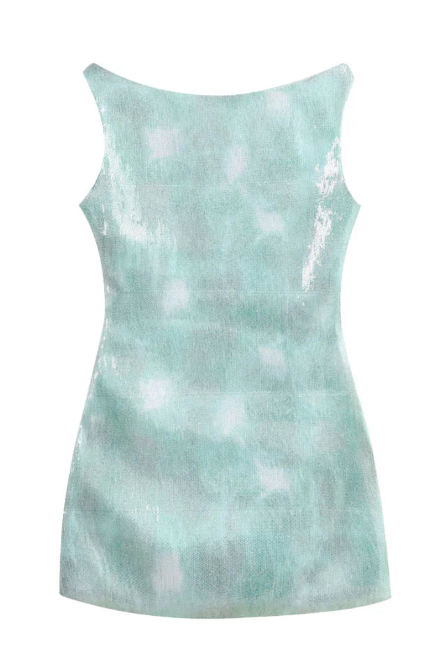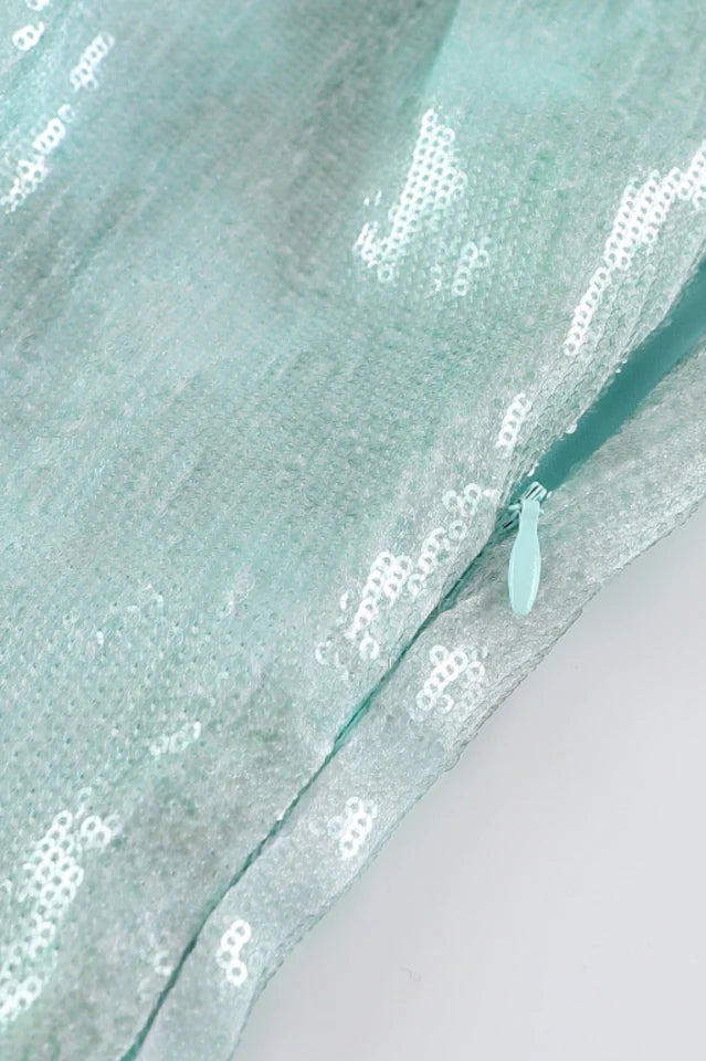 Asymmetrical shoulder detail, ombre glitter pattern, mini length.