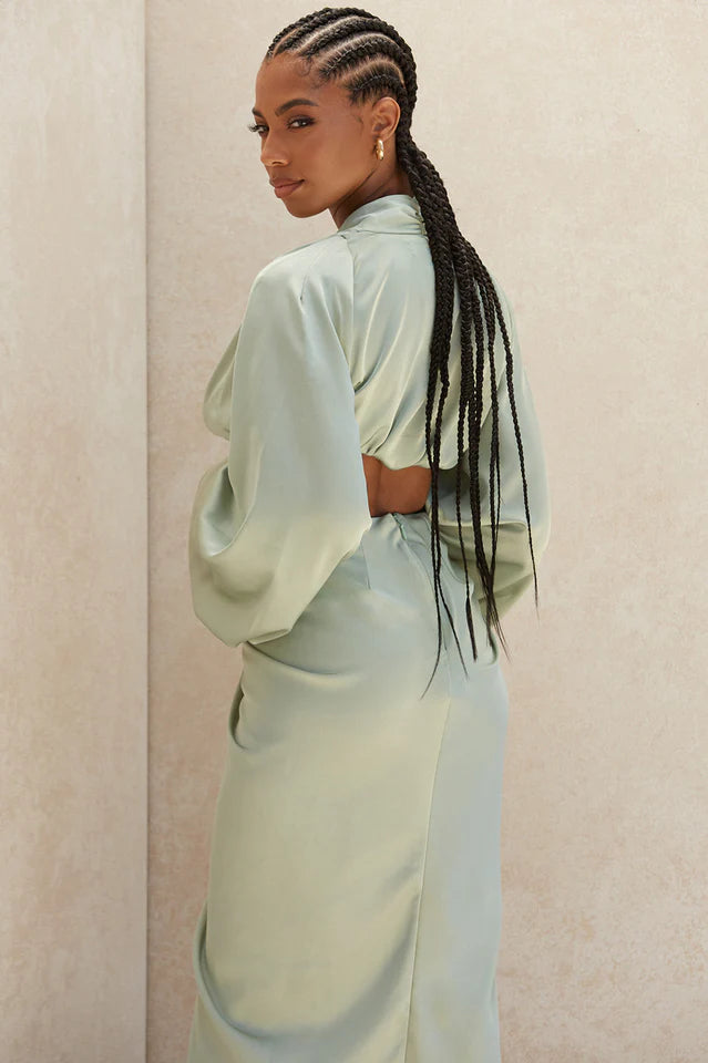 This ultra luxe top is the perfect mix of chic and sexy. It's cut from our lustrous silk satin in a beautiful Sage hue. The top is draped to a twist at the front right under the bust and the balloon sleeves add drama. The deep cuffs are fastened with self fabric buttons and really seal this simple yet luxurious top.