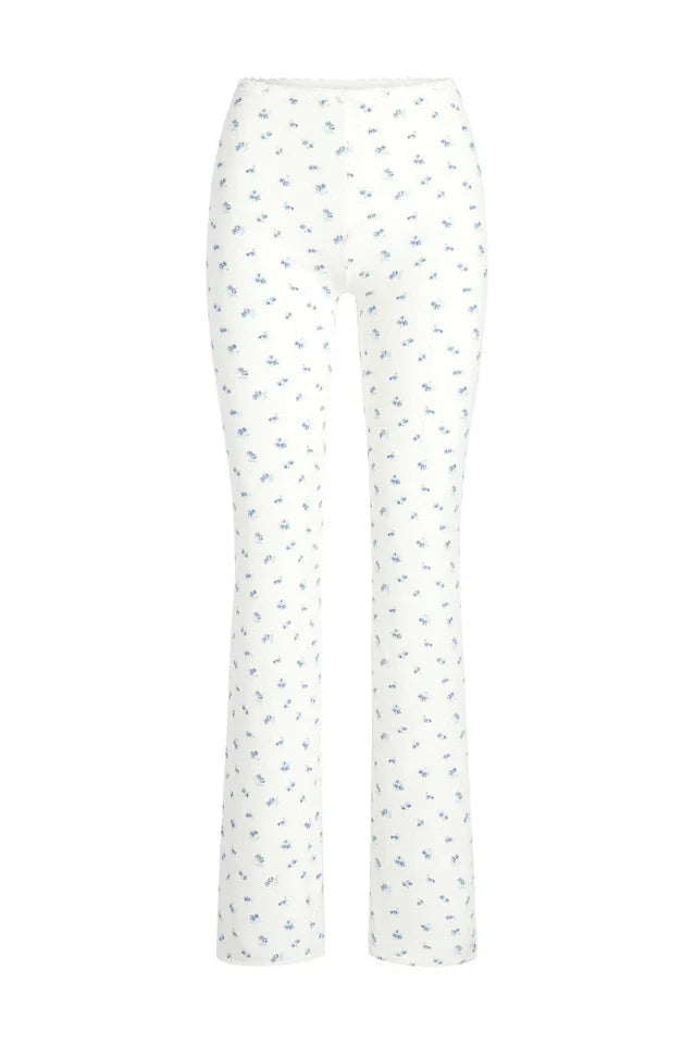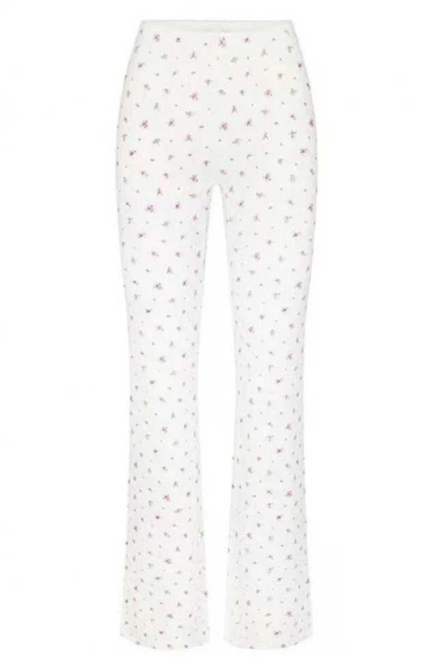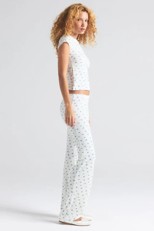 This SKIMS lounge pants set is crafted from ribbed modal. The stretchy style features lace trim along the elastic waist and a rosette detail at the center front. The fit is true to size.