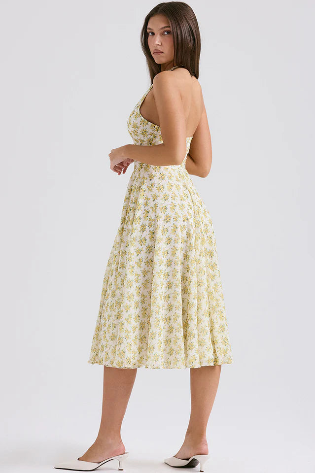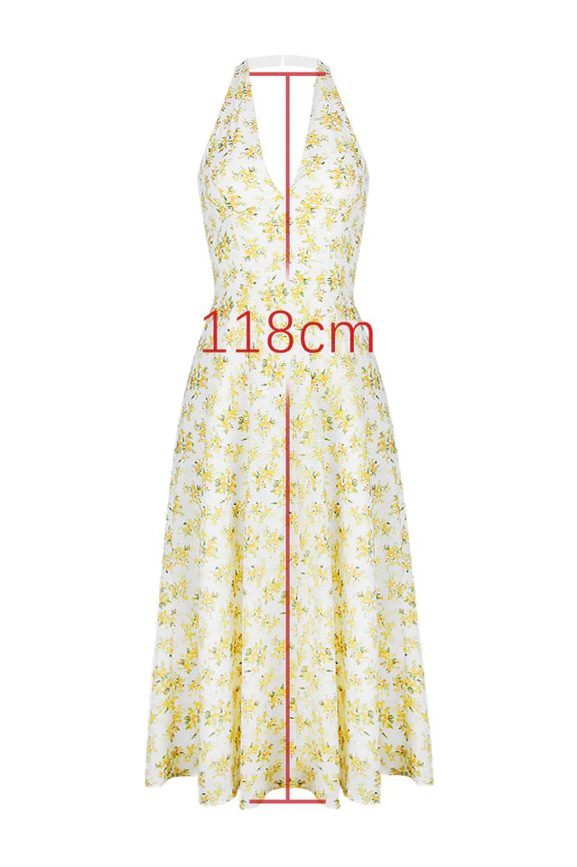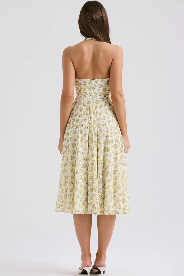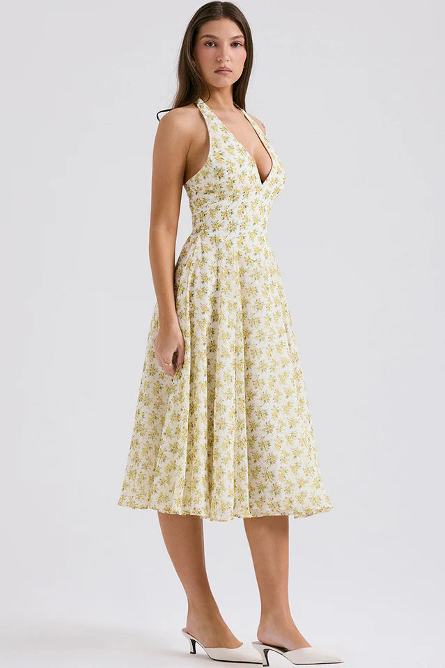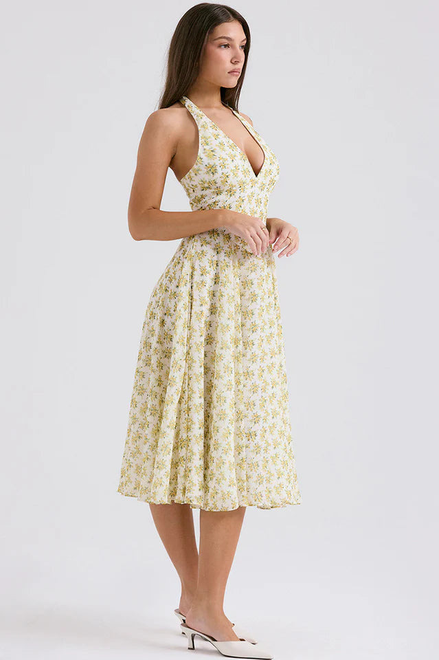 Solada Ivory Vintage Floral Print Sundress will stand out wherever you wear it due to the pretty print and vintage inspired fit. Cut from a floaty georgette, 'Solada' has a daring plunge neckline, flattering halter neck and turns to an open back.