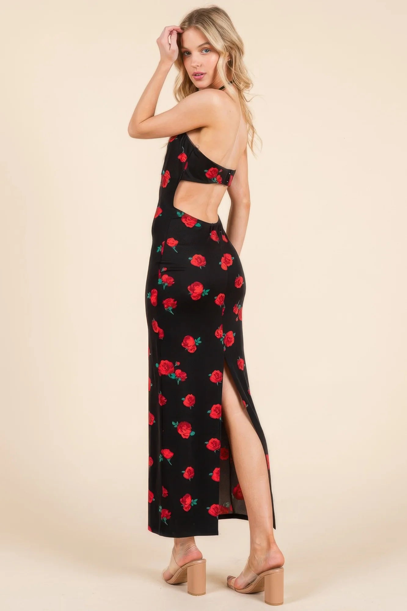 Romantic with a modern edge, this printed midi dress features a sweetheart neckline and gathered bodice that flatter the figure beautifully. The open back is accented by a sleek bar detail and halter neck, offering a striking silhouette from every angle. Crafted from a smooth, stretch-infused fabric, it hugs in all the right places while allowing for easy movement. The back slit adds just the right amount of sophistication and flair. Perfect for weddings, parties, or evening outings, this dress blends elegance with bold detail.