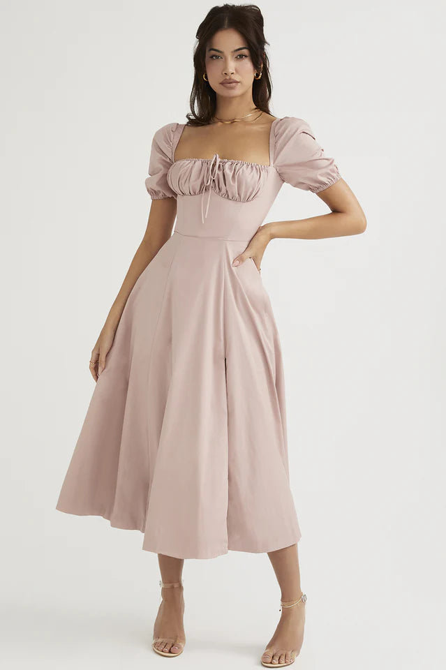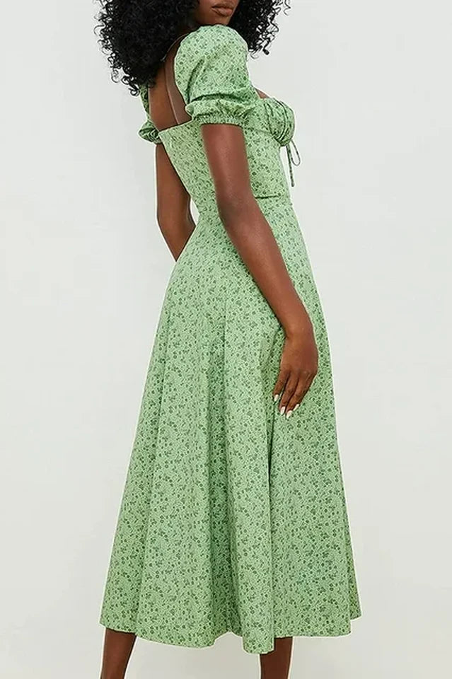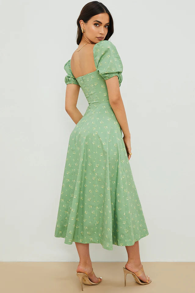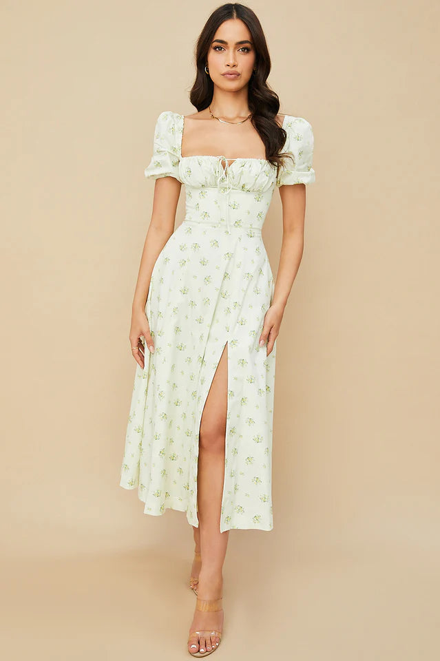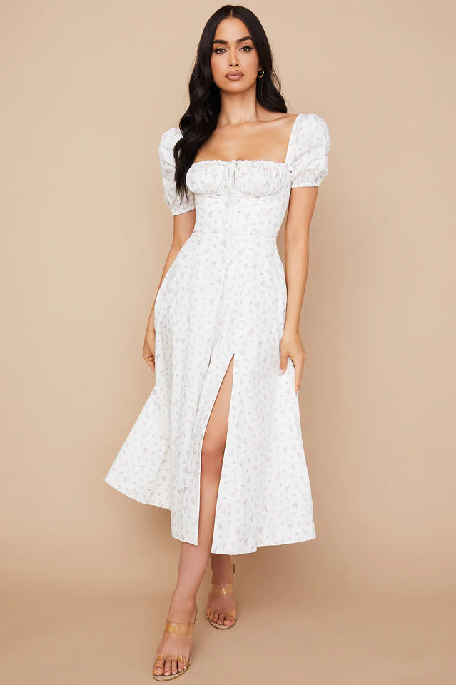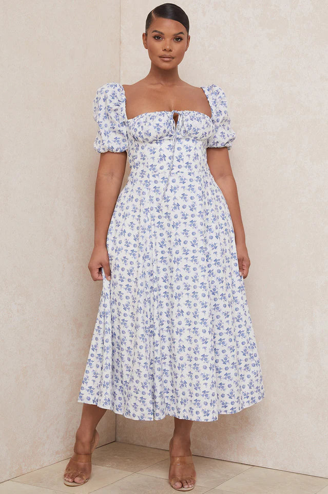 It's cut from our lightweight crepe for a fresh Summer feel and is decorated with a pretty floral print. The bodice has corsetry boning to the front, back and sides for that perfect cinched hourglass shape and the lightly shaped cups are lined for a comfortable fit. we love the way that the side thigh split shows just a flash of thigh as you walk.