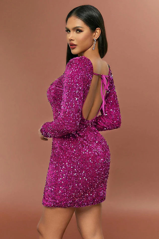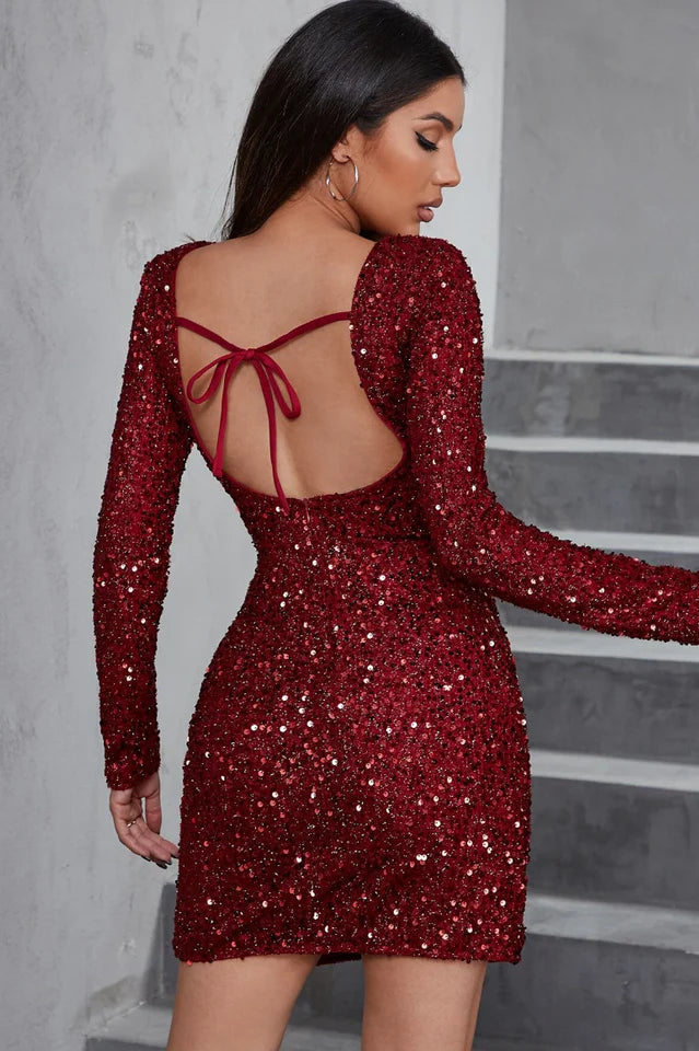 Shine and sparkle in our Time Will Tell sequin mini! The ultimate party dress that you need in your wardrobe this season. This gorgeous number features a boat neck, long sleeves, and a sexy low back with string details. Dress it up with your fave heels and you're ready to make a statement!