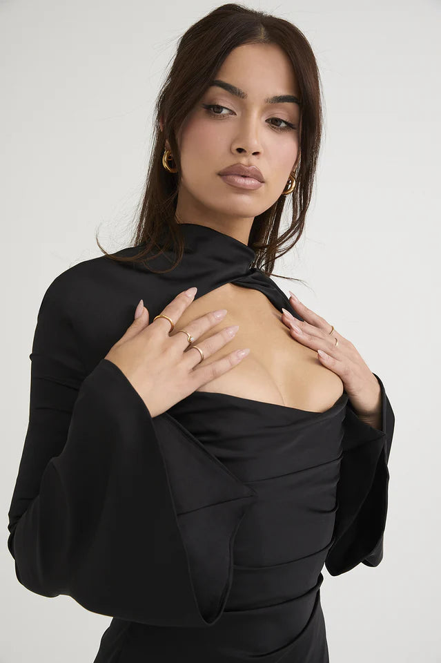 Wrapped at the hips, the 'Toira' drapes to the slightly grooved hem, and cascades delicately across the skirt, down through the arms. Extended sleeves with flared cuffs add a bit of drama. It's lined for comfort and has a zip and button on the back for easy on and off.