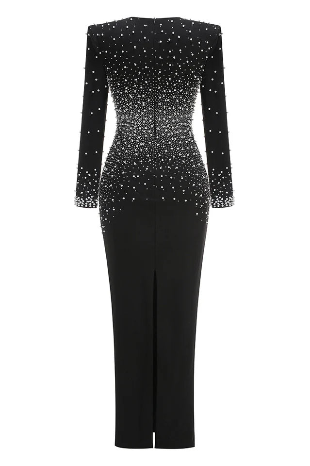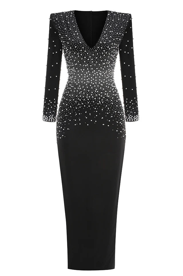 Effortlessly elegant and stunning, our V-Neck Pearl-embellished Long Sleeve Gown is a must-have for any special occasion. The deep V-neckline and delicate pearl embellishments add a touch of sophistication, while the long sleeves provide coverage and comfort. Make a statement and turn heads in this timeless and luxurious gown.