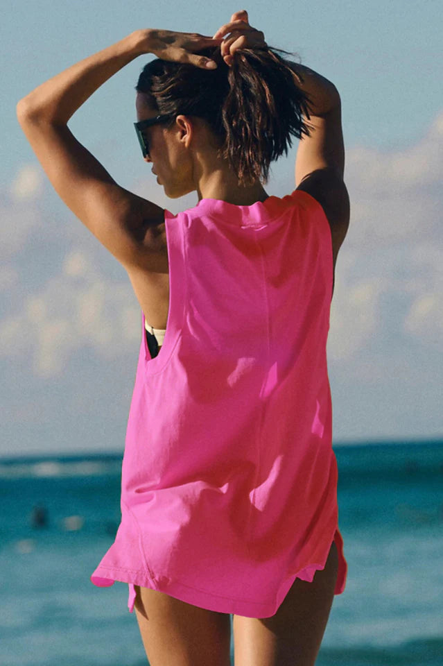 The Velocity Tank Top is an oversized, longline silhouette made with a smooth and lightweight 100% cotton fabrication. This racerback tank top features dropped armholes, a deep v-neck, a patch pocket at the front, and a side seam slit detail.