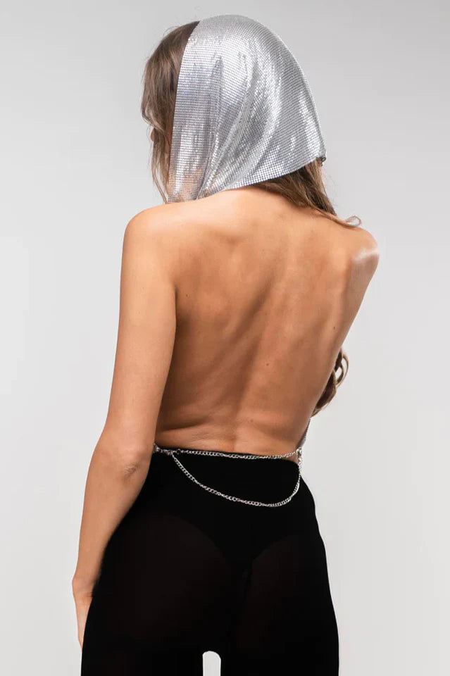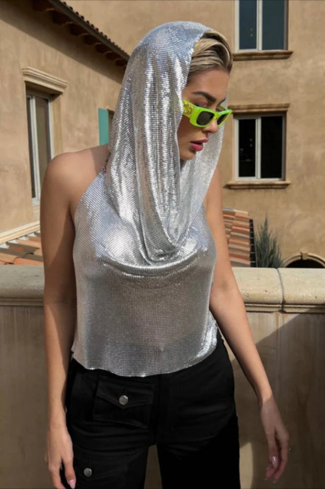 This top is a beautiful and elegant piece that will elevate any outfit. Handcrafted with high quality silver aluminum wire mesh, this top drapes gracefully over your upper body, creating a unique and eye-catching look. The addition of the metallic mesh hoodie adds a touch of edginess to the design. The reflective material makes it perfect for any event, as it will catch the light and make you stand out from the crowd. Wear this piece alone to make a bold statement, or layer it with your favorite outfit for an extra touch of sophistication. The Trinity Metallic Top is a versatile addition to your wardrobe that you will return to time and time again.