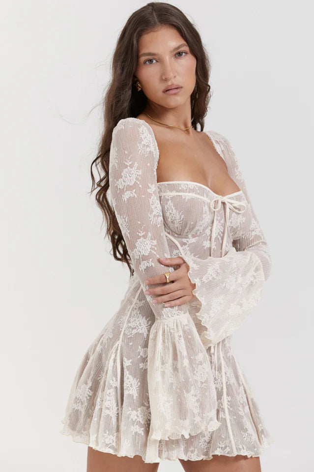 The Vintage Cream Lace Belted Dress is made from beautiful printed lace with delicate satin trim and lined with our skinny mesh for great coverage. The dress features lined cups, a sweetheart neckline and an internal boning to cinch the waist. We love the exaggerated pleated cuffs on the long sleeves, which complement the flowy mini hem.