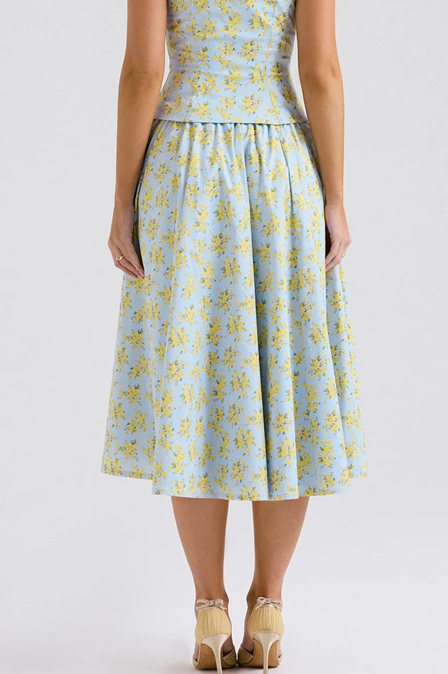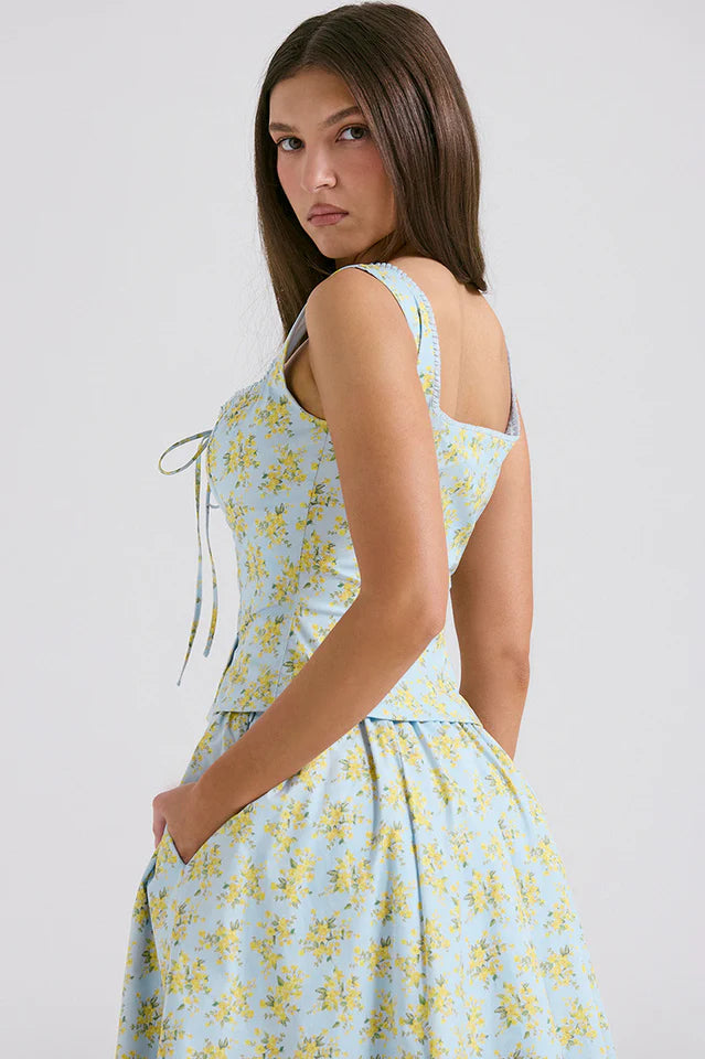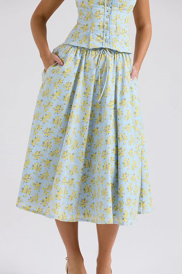 'Cora' is a pretty Spring and Summer staple making it the perfect vacation ready piece. Cut from stretch cotton-rich fabric in a beautiful soft blue vintage print, it sits low on the waist and the threaded ties add pretty drama for the perfect fit.