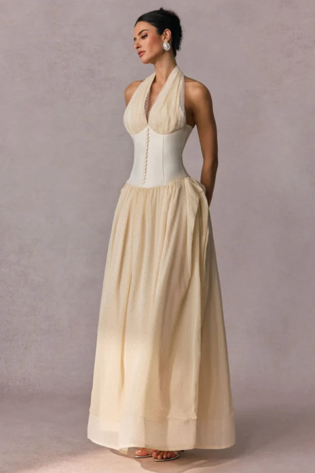 The Vivien Halterneck Tulle Overlay Maxi Dress features chiffon pleats, stud embellishment, and a cinched waist with supportive boning. Designed for elegant comfort, it’s a chic choice for weddings, vacations, and seasonal celebrations. Admired among modern semi-formal wedding guest dresses, it also shines as one of the most sophisticated summer maxi dresses.