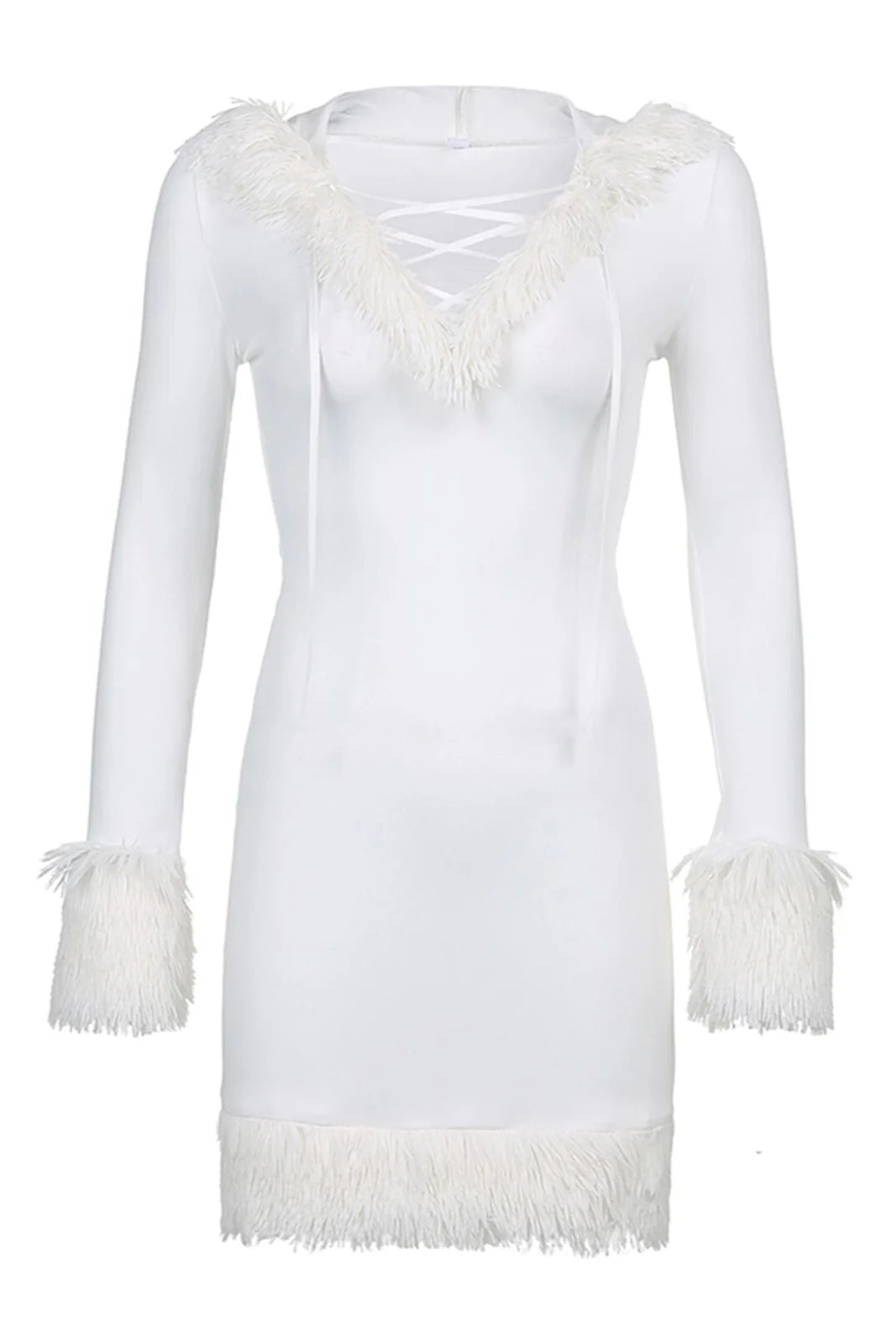 Step into the spotlight with this White Fur Lace-Up Hooded Dress Sexy Costume. Featuring a soft fur trim and a flirty lace-up front, this hooded dress combines cozy charm with a daring edge. Perfect for festive parties or playful nights out, it effortlessly blends warmth and allure to turn heads wherever you go. Embrace your adventurous side with this fun and eye-catching look.