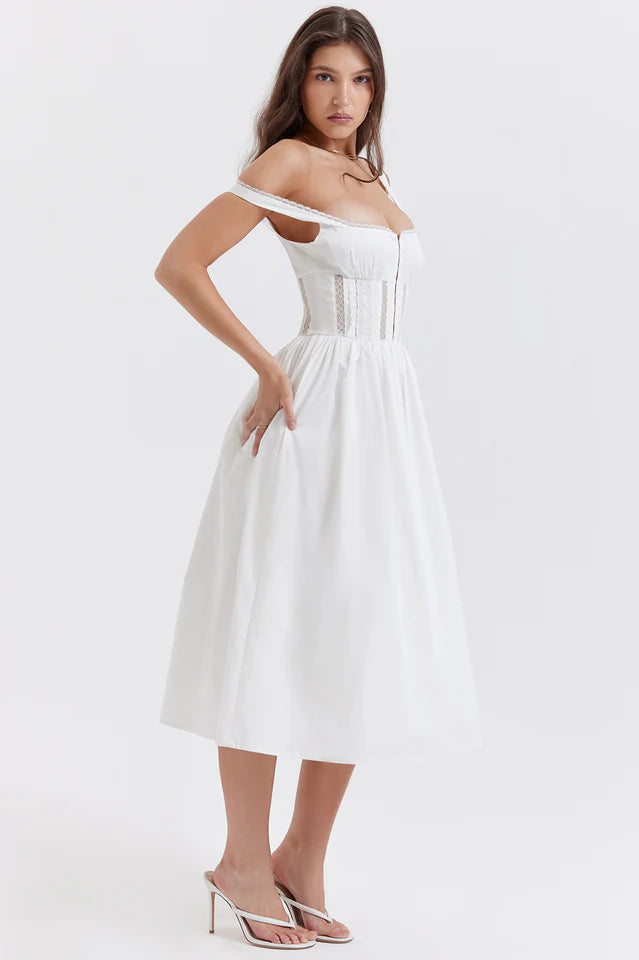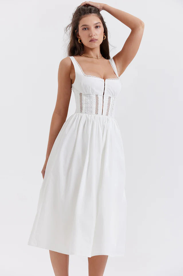 A crisp white dress is a spring staple that will take you through to warm summer days and cool evenings. Cut from stretch cotton, White Lace Trim Midi Dress is feminine and floaty and features a square neckline, edged in a delicate lace trim and the close fitting bodice has pretty lace panels to reveal a glimpse of skin.