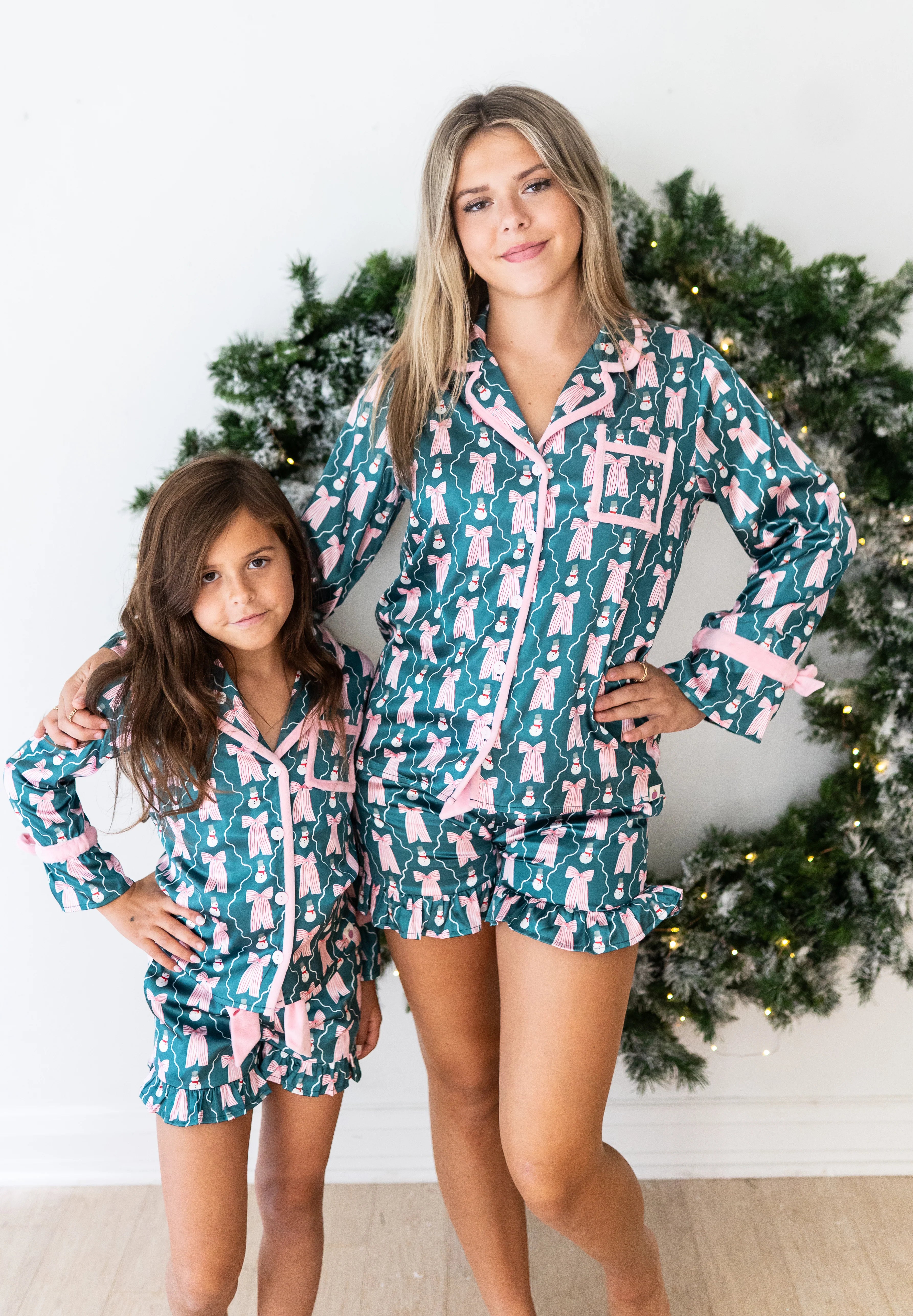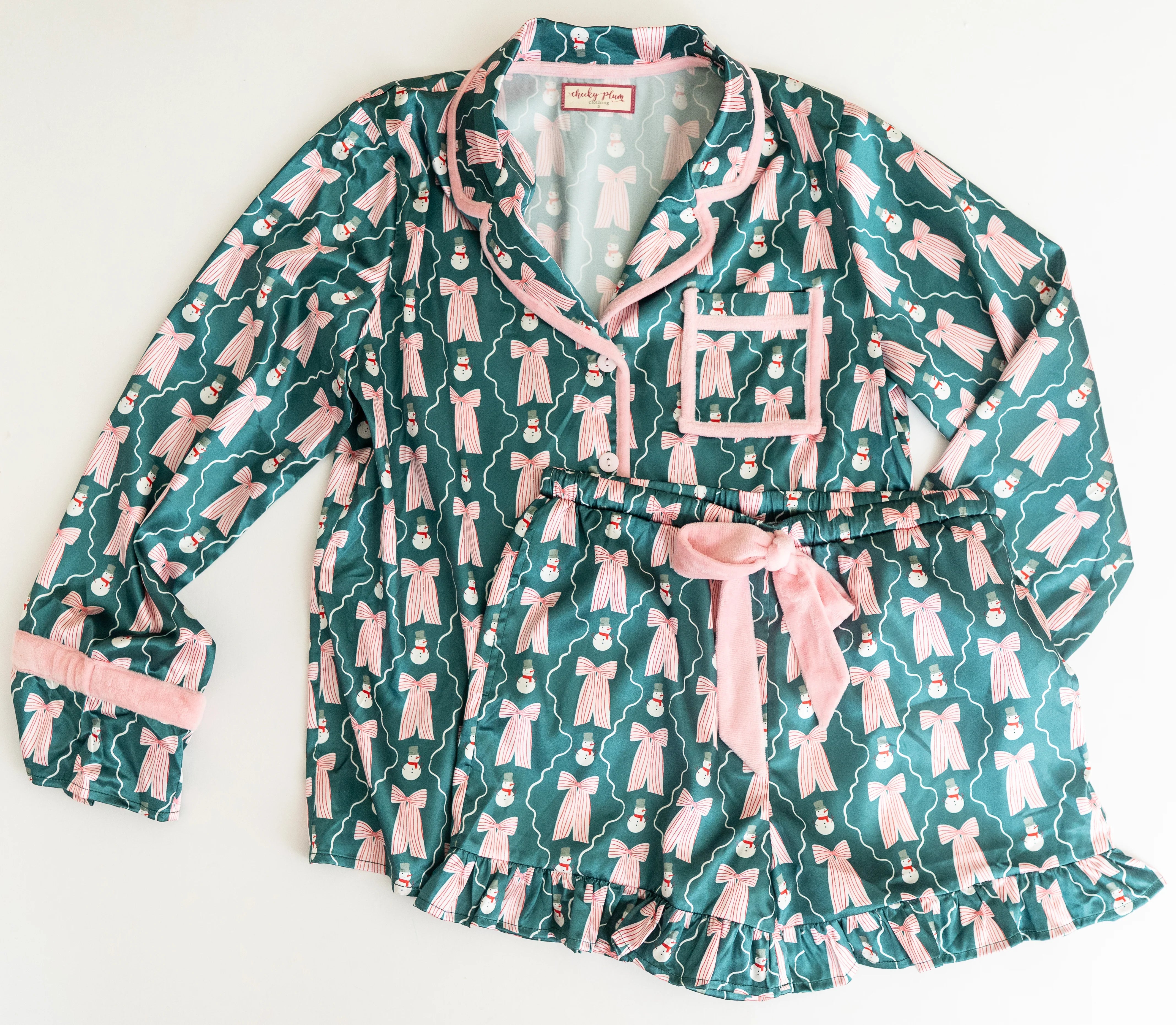 Stay festive and comfy in the Women Satin Lounge Set – Frosty Boutique, designed with the sweetest snowman-and-bow print. Featuring a button-front top with contrast piping and ruffle sleeve detail plus matching shorts with a ruffle hem, this set is perfect for cozy holiday mornings, lounging in style, or matching moments with your mini.