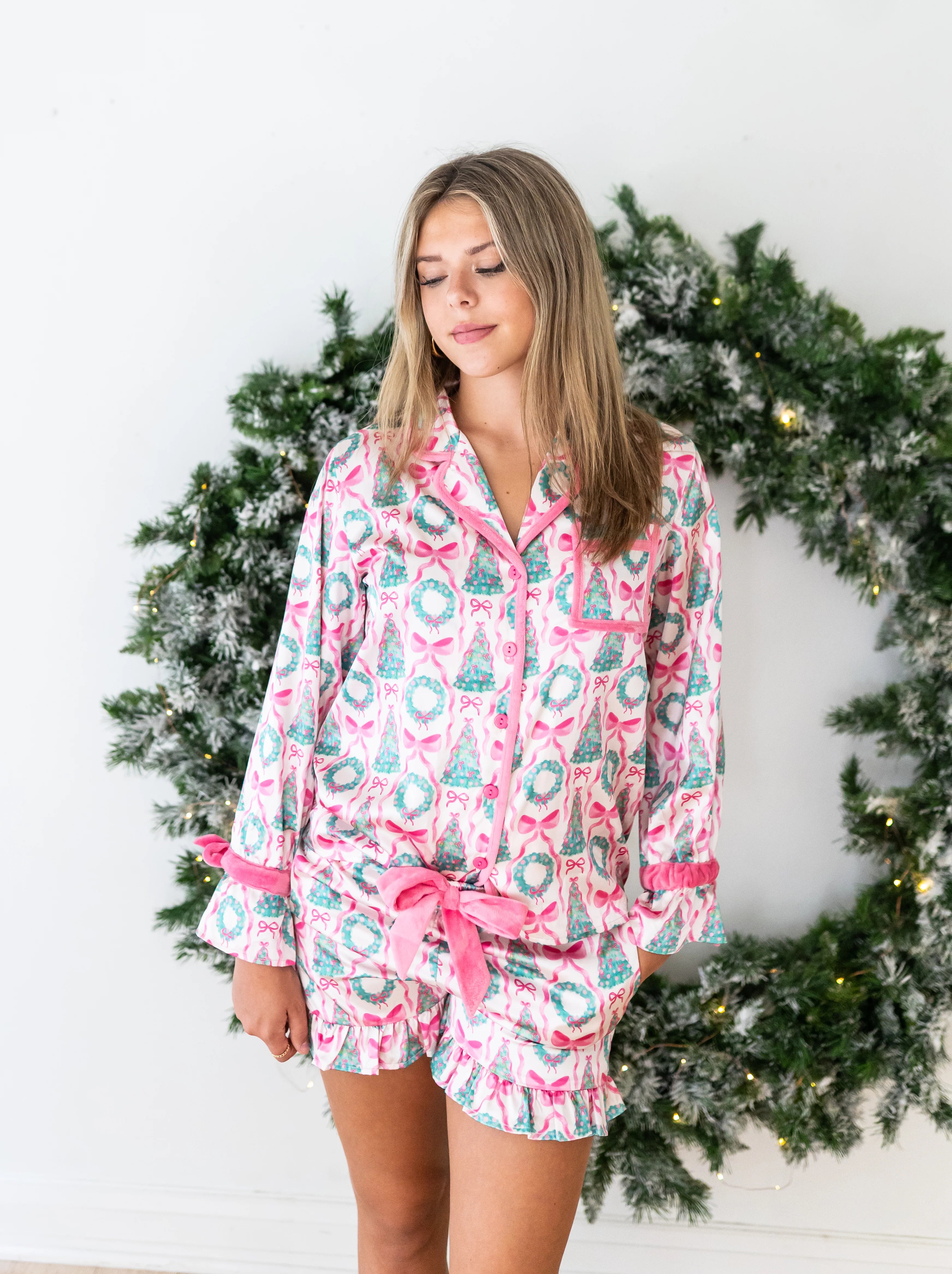 Wrap yourself in festive comfort with our Women's Satin Loungewear Set – Wreath & Wonder. These light pink pajamas feature a charming pattern of wreaths, Christmas trees, and bows, accented by a darker pink trim for a playful touch.